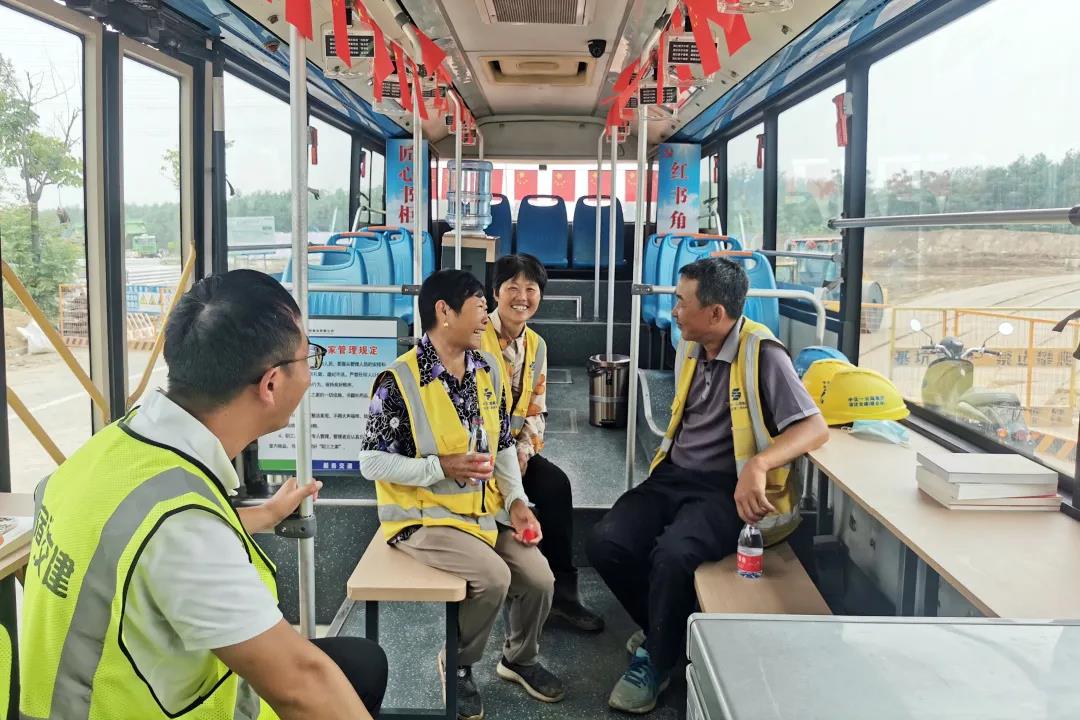 据了解,“宿迁交建·流动职工之家”由公交车改造而成,车内设置17张独立座椅、三张餐桌,配有空调、冰箱、饮水机、应急药箱以及容纳280余本书籍的红书角,切实为施工一线职工提供用餐、休息、学习的场所;车身外观展示了该公司党总支“匠心筑路党旗红·交建先锋”的品牌符号以及色漫文化