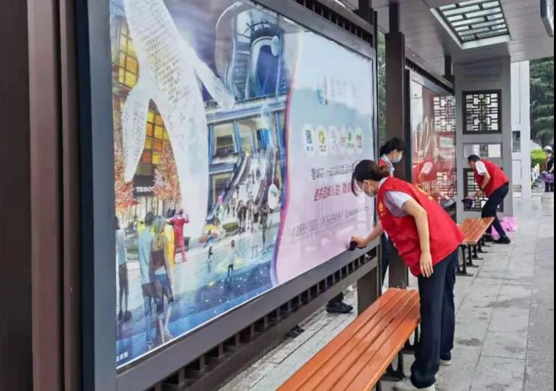 活动中,党员志愿者们统一穿戴志愿服务马甲,拿着抹布、水桶、扫帚等工具对洪泽湖路段公交候车亭、电子站牌、公益画面、凳子及周边环境进行清理,更换新的公益画面幅。经过半天的清理打扫,公交候车亭的活动区域焕然一新。