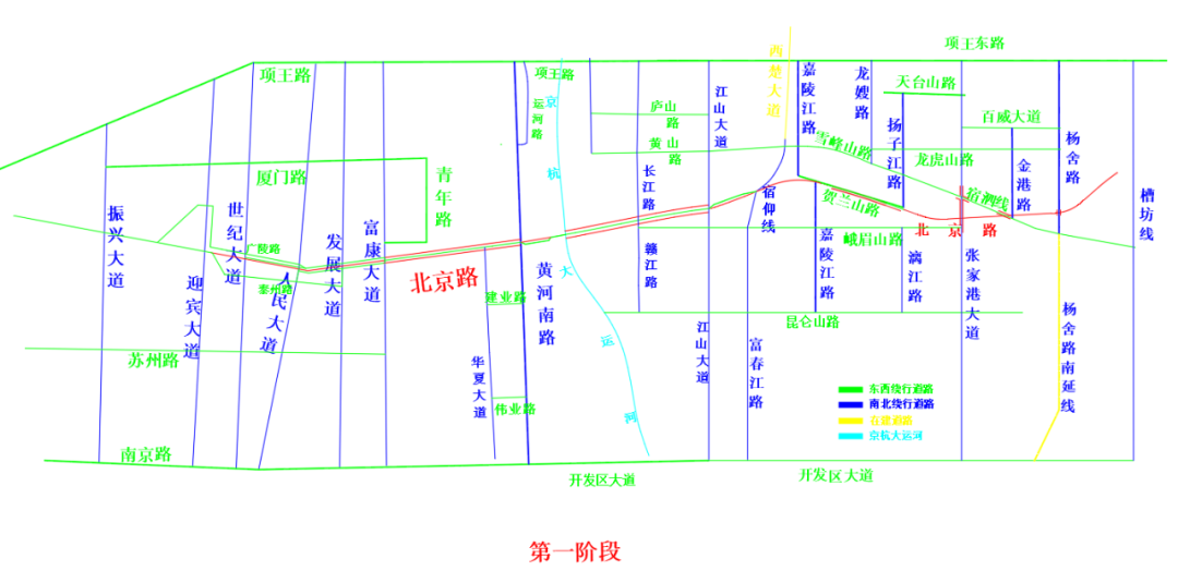 第一阶段 (2021年7月16日至2022年8月20日) 封闭北京路(迎宾大道至人民大道)段,东西方向车辆由南侧泰州路与北侧广陵路单向行驶,经发展大道南北侧辅道行驶至富康大道,富康大道至黄河南路正常行驶。原三号桥南半幅保持双车道通行,运河东至江山大道正常行驶,江山大道—西楚大道北半幅保持双向两车道通行。