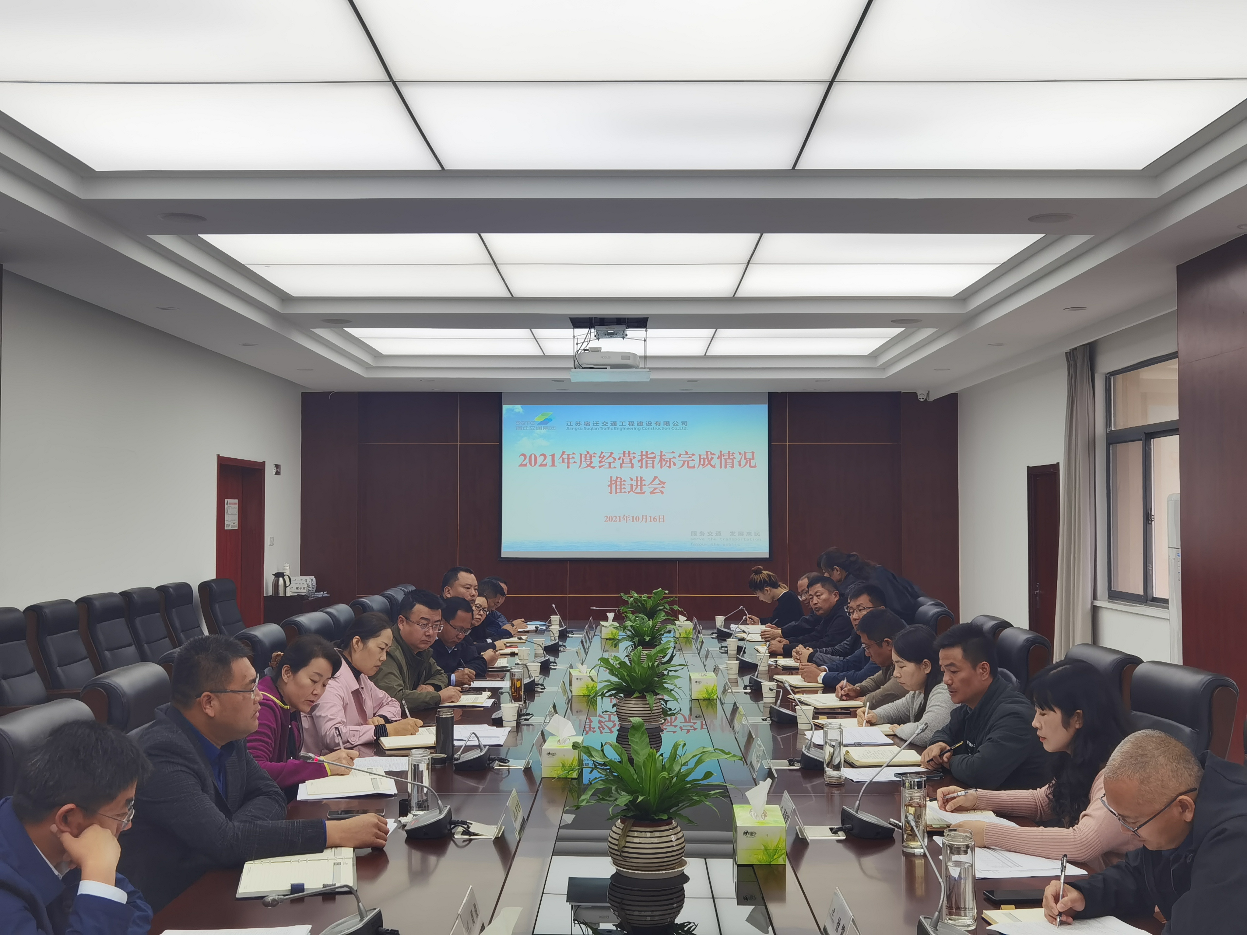 10月16日, 宿迁交建召开2021年度经营目标推进会,对照全年目标任务,全面检查指标完成情况,查漏补缺,动员全体,全力冲刺年度目标任务。