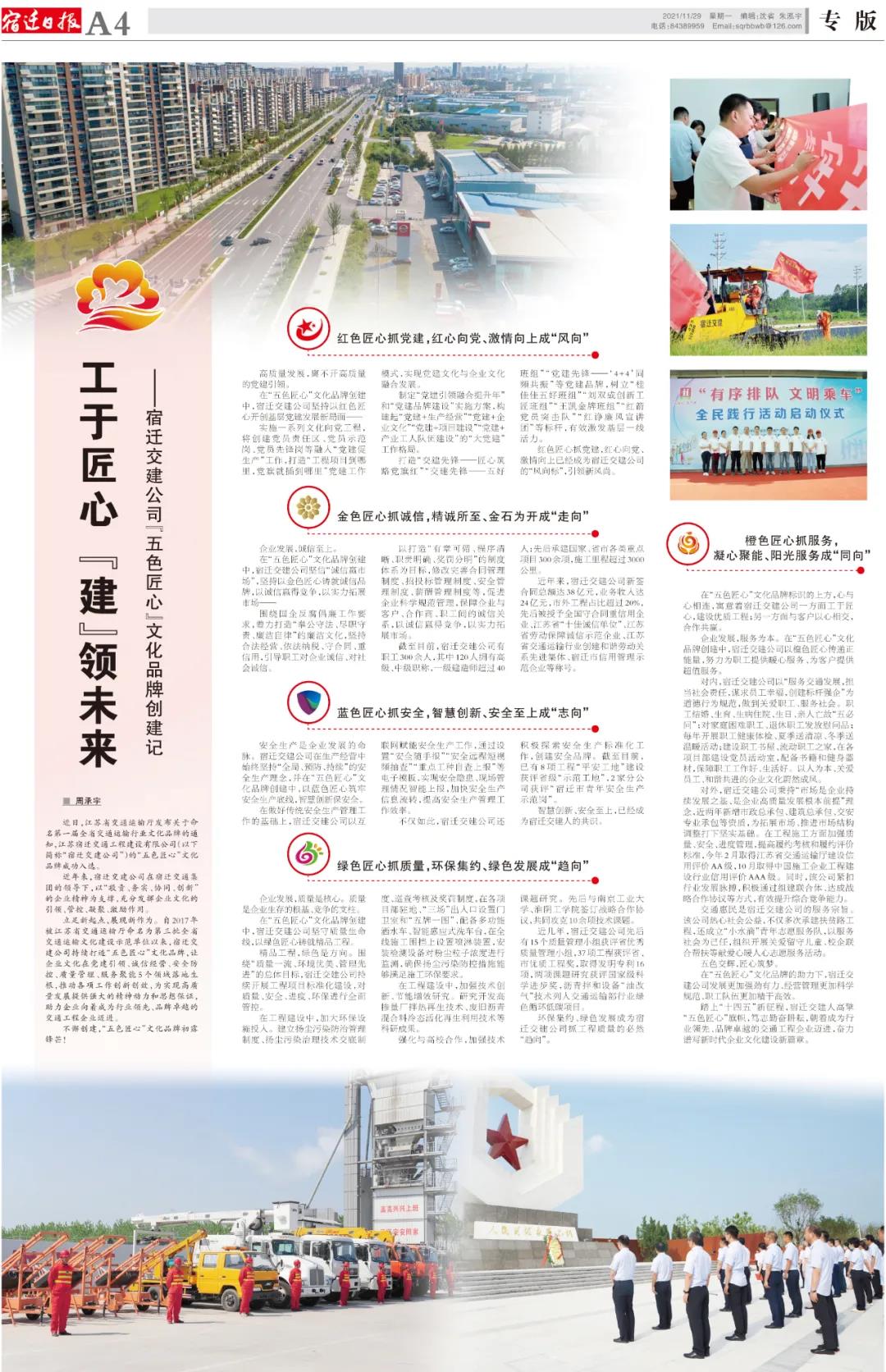 11月29日,《宿迁日报》以《工于匠心 “建”领未来——宿迁交建公司“五色匠心”文化品牌创建记》为题专版报道了宿迁交建公司成功入选第一届全省交通运输行业文化品牌的创新举措和经验做法。全文报道如下。
