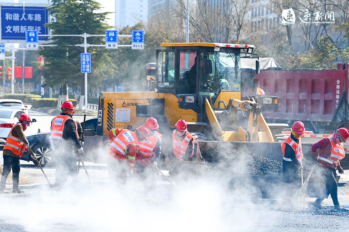 2月19日,宿迁市迎宾大道二期快速化改造工程建设现场一片火热,数十台车辆及机械设备正在进行沥青下面层摊铺,建设者开足马力,加快推进工程进度,力争早日建成通车。