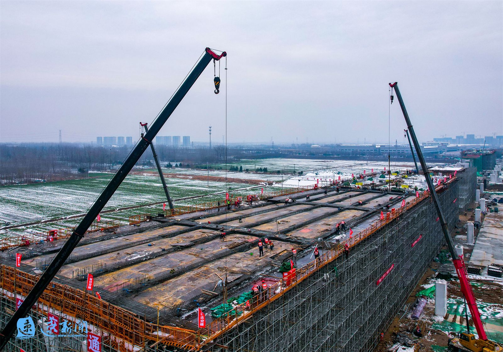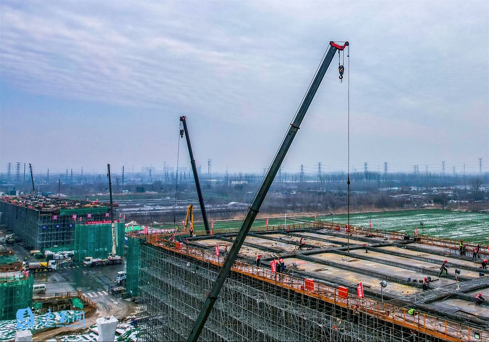 2月28日,在宿迁市酒都路(原张家港大道一期)快速化改造工程现场,施工器械不断运转,工人正在紧张施工。