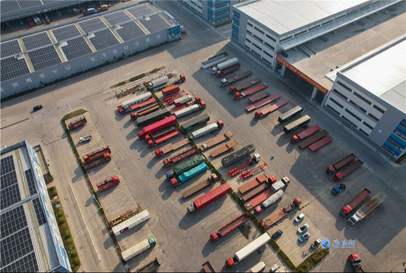 近日,宿迁经开区江苏通湖物流园内,工作人员正在有序作业,运输车辆来回穿梭,一派繁忙景象。