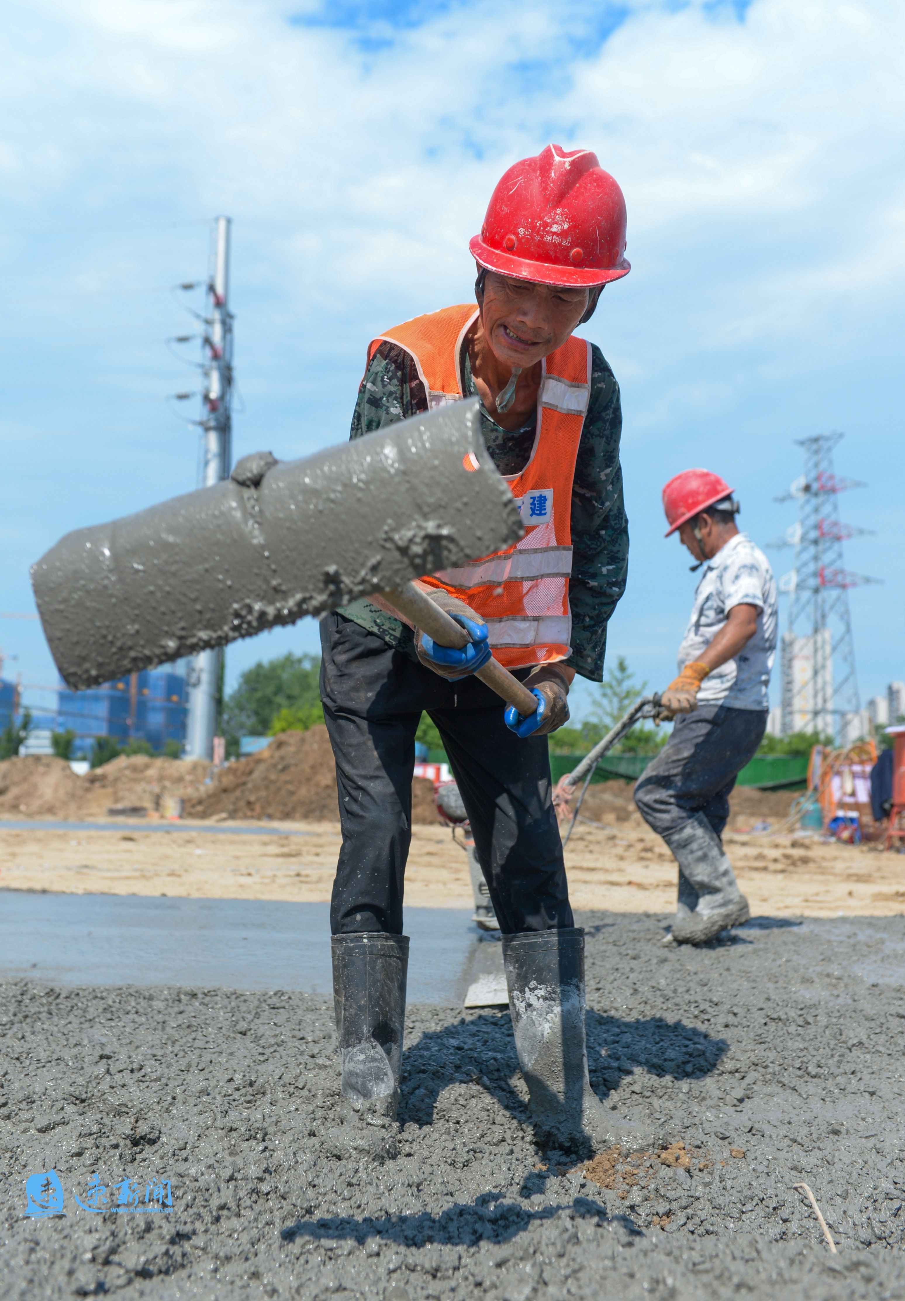 7月23日,在宿迁市宿豫区酒都路快速化改造工程现场,建设者不惧高温“烤”验,加紧施工作业,全力推进项目建设进度。