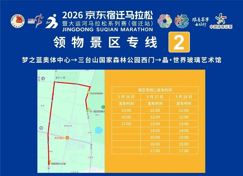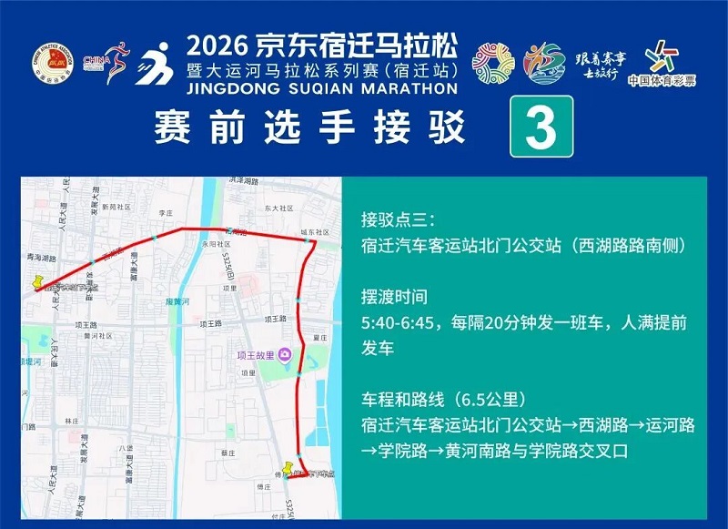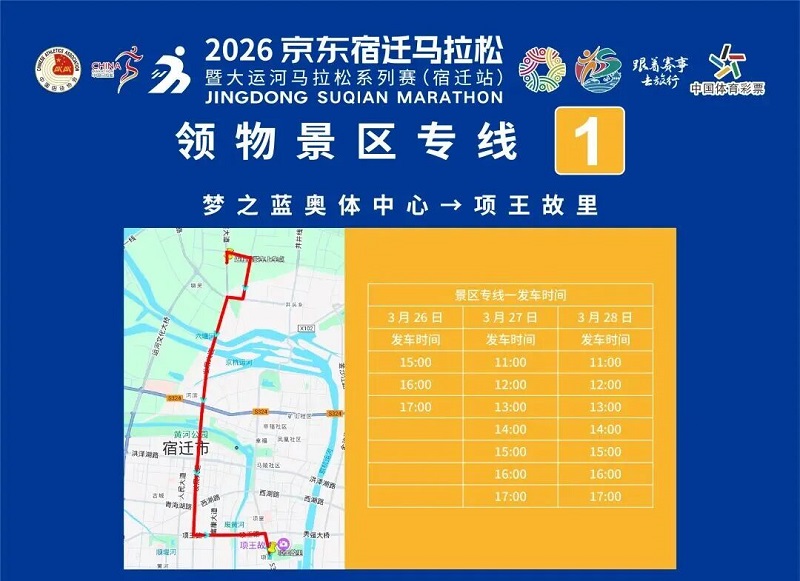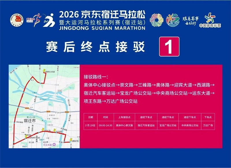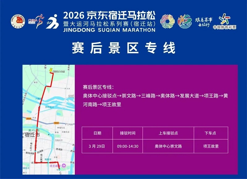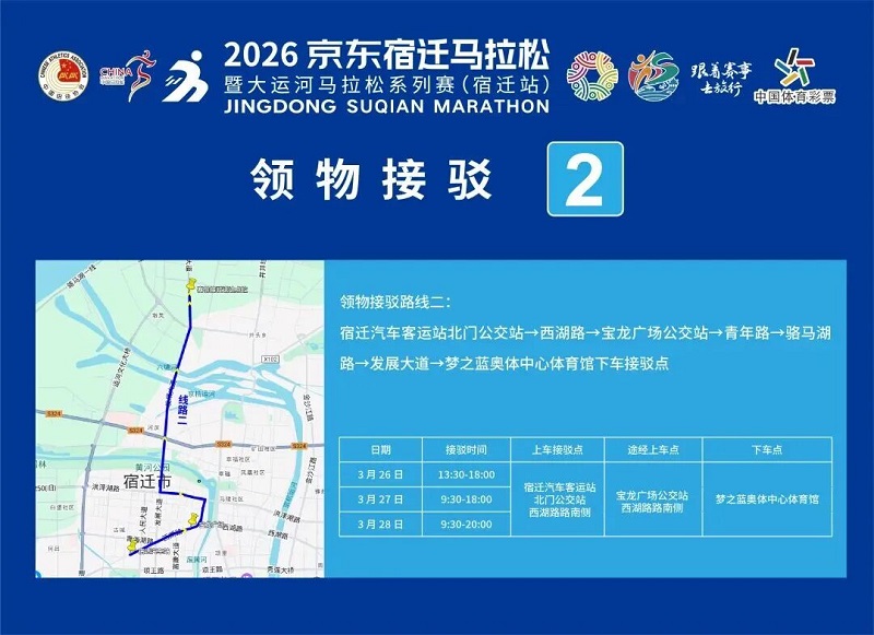 3月26日-30日,参赛选手可凭号码布或中签短信,免费乘坐宿迁市区内(宿城区、宿豫区、洋河新区、湖滨新区)公交车。