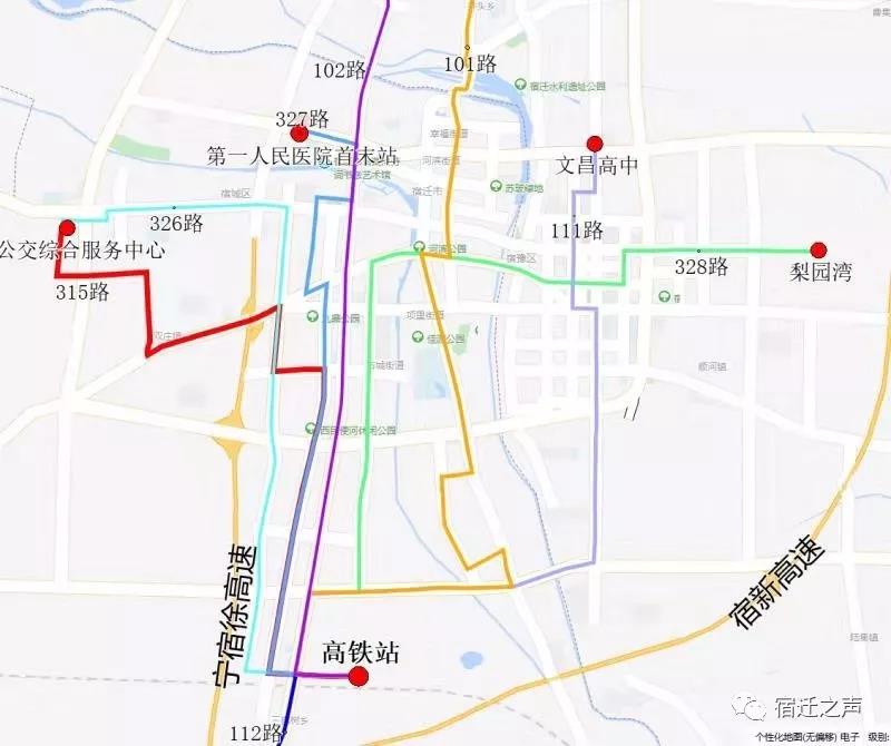 111路(文昌高中至宿迁高铁站)。主要途径:文昌高中—江山大道—燕山路—珠江路—项王路—江山大道—运河发展大道运河桥—南京路—发展大道—上海路—宿迁高铁站。计划投入10辆公交车。