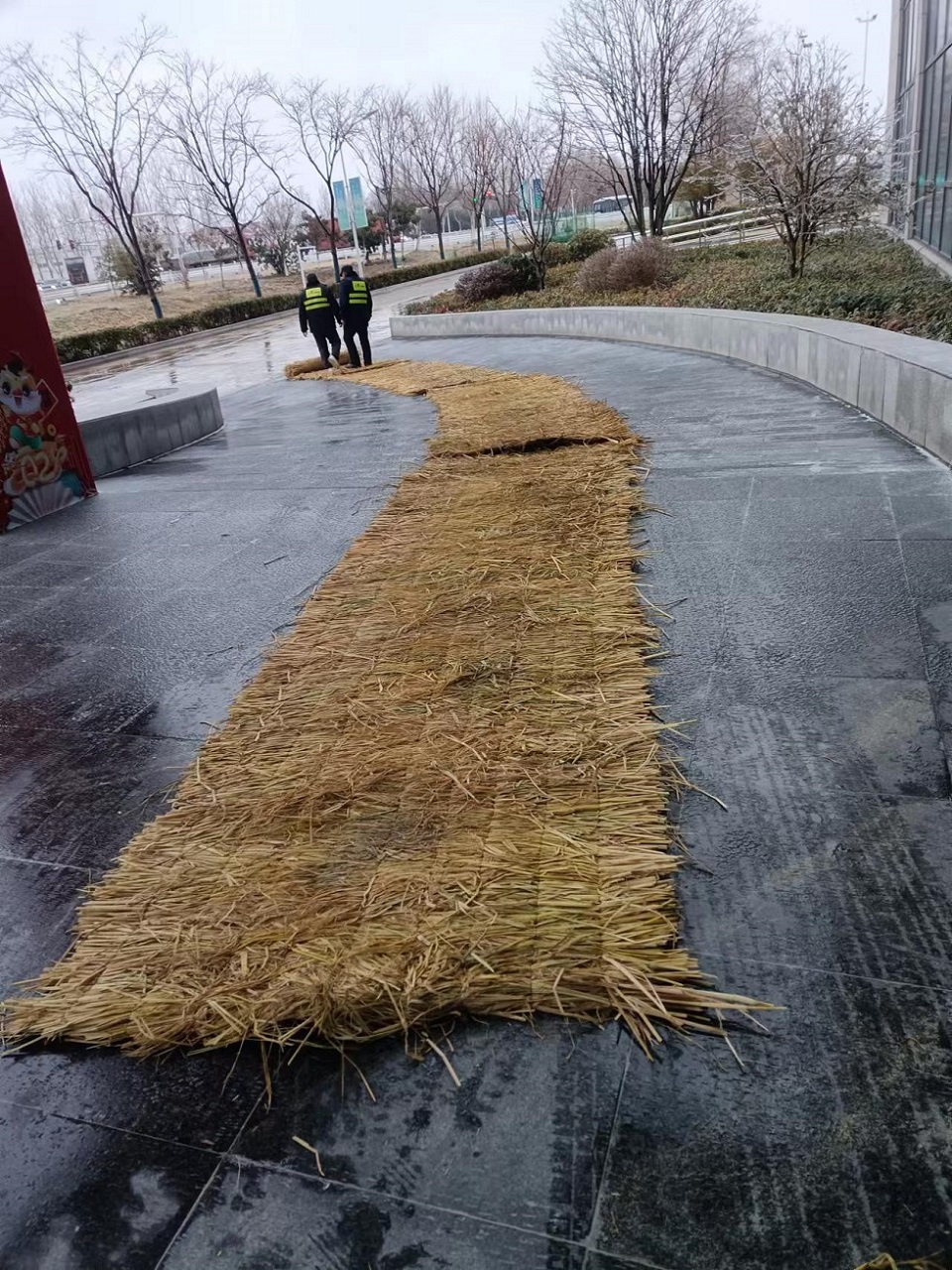 通湖物流园提前储备防滑材料、融雪剂等应急物资,在园区入口、坡道等重点路段铺设防滑草垫,防止出现事故;做好园区内物流企业安全宣教工作,督促企业提醒货运司机注意应对严寒冰冻天气,确保行车安全。