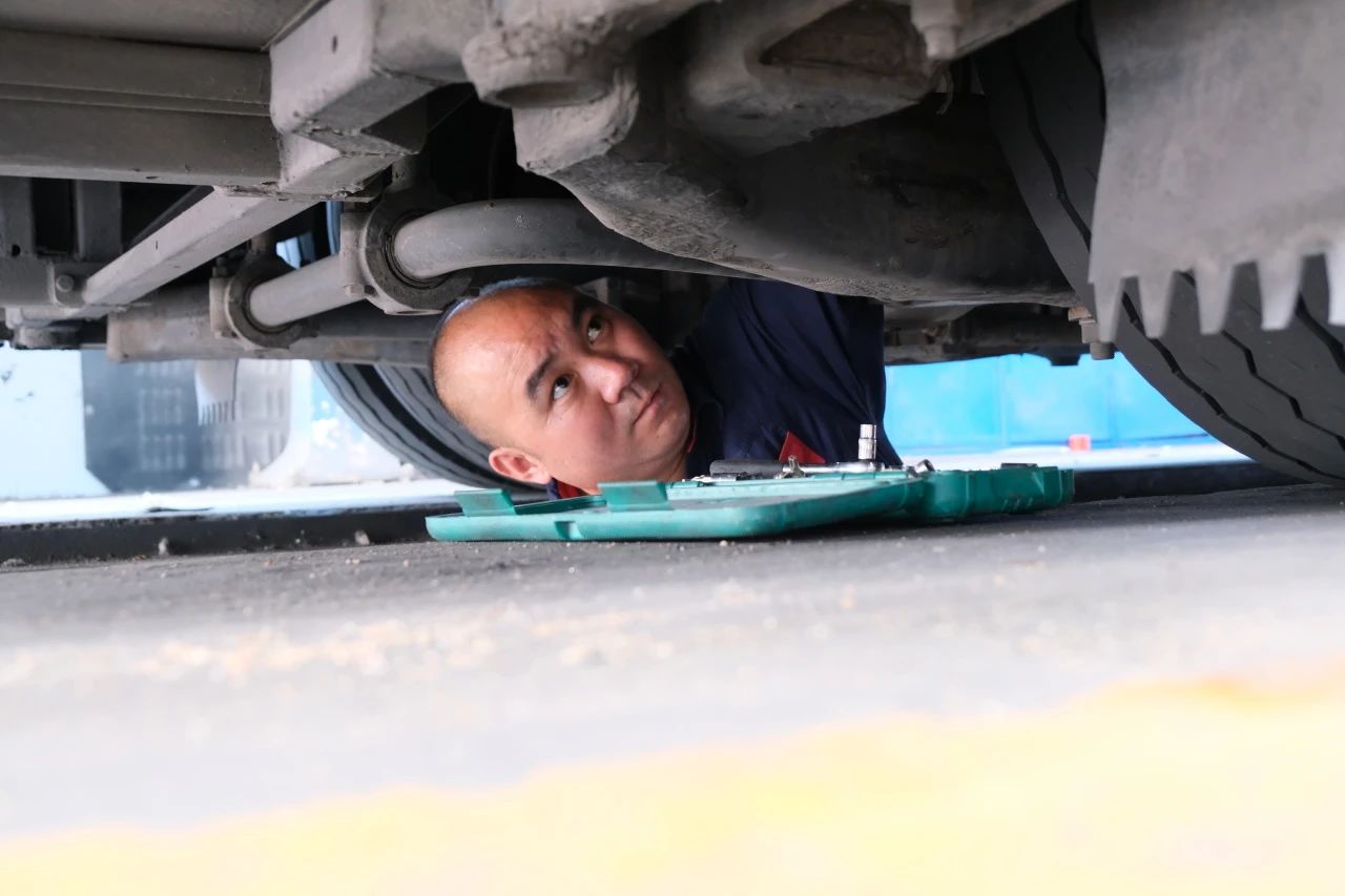 上午10点,阳光已经变得格外“毒辣”,走进维修车间,一股混合着机油、橡胶和热浪的灼热气息扑面而来。维修车间内,温度高达40℃以上。刚驶入车间的公交车引擎盖下,温度更是接近60℃,站在旁边都能感受到热浪滚滚。维修工赵贺贺师傅正钻在公交车底部,对车辆的底盘进行检查,深蓝色的工装早已被汗水湿透,紧贴在背上。“发动机刚停机,温度有70℃以上,手不能触碰。”赵师傅抹了把脸笑道,“但再热也得修,不能让一辆‘病车’上路。”