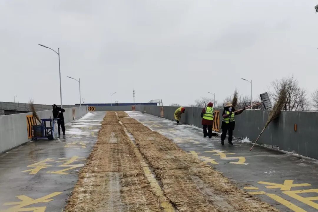 通湖物流园对内部主干道路、仓储区域等处,撒好除雪剂并进行融雪、除雪,在仓库出入口、坡道等易滑区域铺设防滑设施,通过微信群、广播等渠道,向租户滚动发布天气预警与安全提示,全力减轻寒潮影响,保障园区平稳运行。