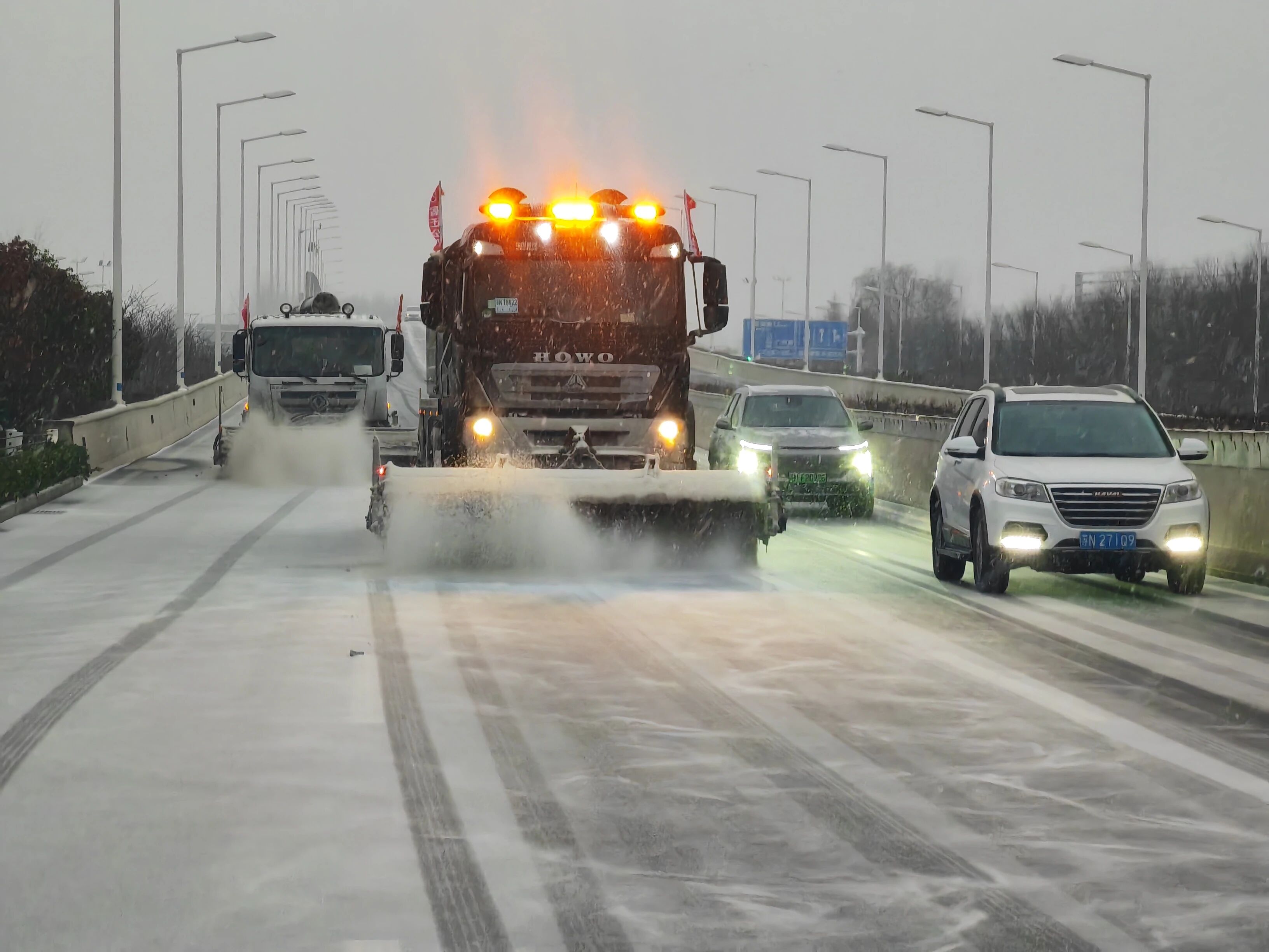 高铁公司养护人员24小时待命,根据道路实际情况,灵活调配设备和人员对快速路网开展全覆盖除雪。截至目前,共投入除雪机械设备35台、撒布融雪剂400吨,出动人员120人,所辖管养快速路安全畅通。