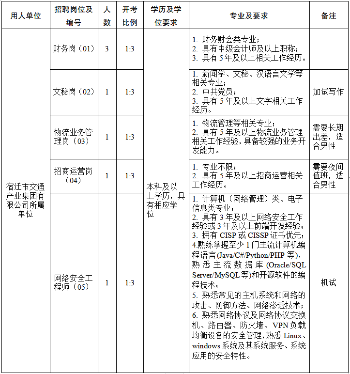 ”)成立于1998年9月,注册资金15.5亿元,为宿迁市人民政府直属国有企业,主体信用评级AA+。主要负责市政府授权范围内的国有资产投资、建设、运营、管理等相关业务。集团经营范围涉及交通工程建设与施工、港口码头、城市公交、长途客运、现代物流园区、片区开发、道路养护、建材销售、公共停车、汽车租赁、交通传媒、通用航空等业务板块。截至2023年底,集团总资产超 400 亿元,员工总数近 3000 名。为满足业务发展需要,现面向社会公开招聘业务工作人员。