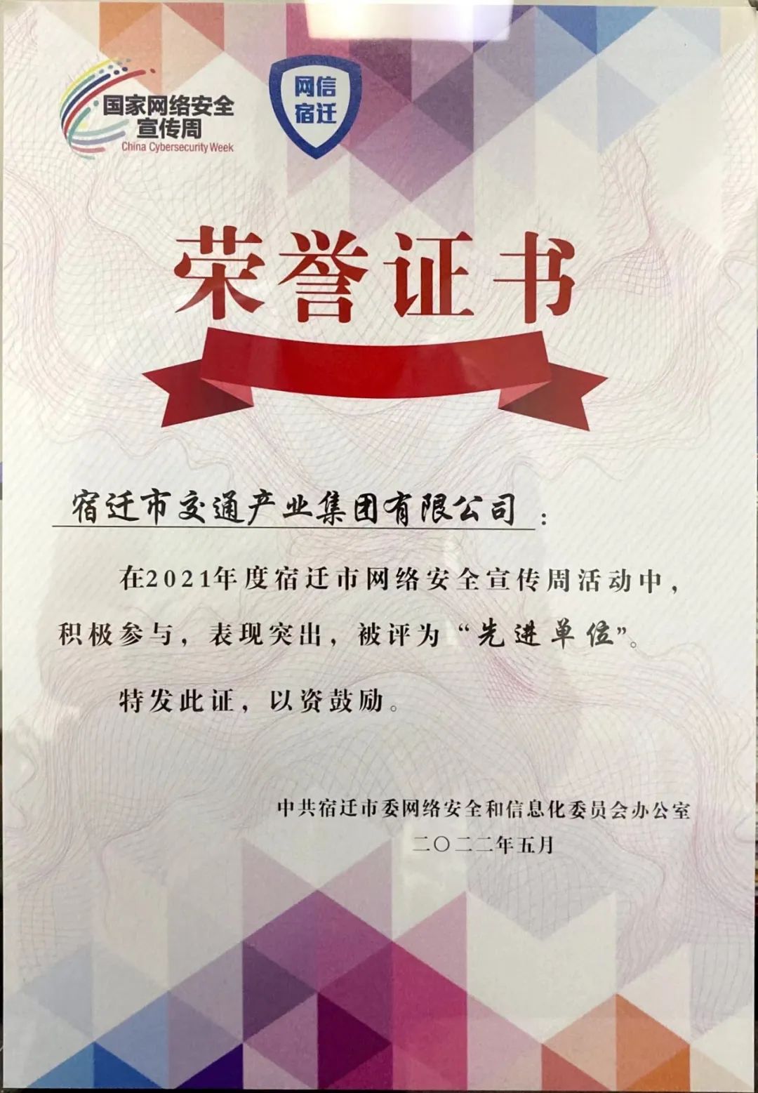 5月24日,从宿迁市网络安全工作推进会上获悉,集团荣获2021年度宿迁市网络安全宣传周活动先进单位。