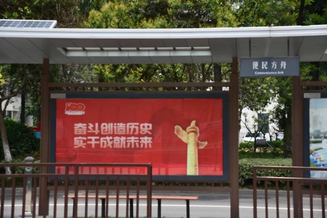 宿迁交通传媒累计制作260余幅宣传标语公益广告,投放公交候车亭、停车场道闸、高铁宿迁站等处,同时利用迎宾大道与北京路互通高立柱,全天循环播放庆祝中国共产党成立100周年宣传标语,扮靓城市容貌,点燃城市热情。