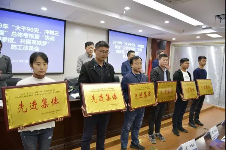 会上宣读了2019年“大干90天,冲刺三季度”劳动竞赛活动总体考核文件及“决战四季度、共圆高铁梦”劳动竞赛活动通知,并对劳动竞赛考核成绩突出的先进集体、先进个人及项目完成情况较好的项目经理部颁发了荣誉证书和奖牌。市综合客运枢纽建设工程各项目经理部、监理单位负责人分别作表态发言。
