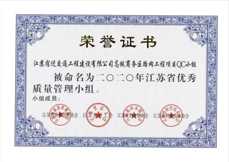 近日,宿迁交建的“高铁商务区路网工程项目QC小组”被江苏省质量管理协会、江苏省总工会、江苏省妇女联合会、江苏省科学技术协会授予“2020年度江苏省优秀质量管理小组”称号。同时,该课题还被江苏省质量管理协会确认为江苏省优秀质量管理小组活动三级技术成果。
