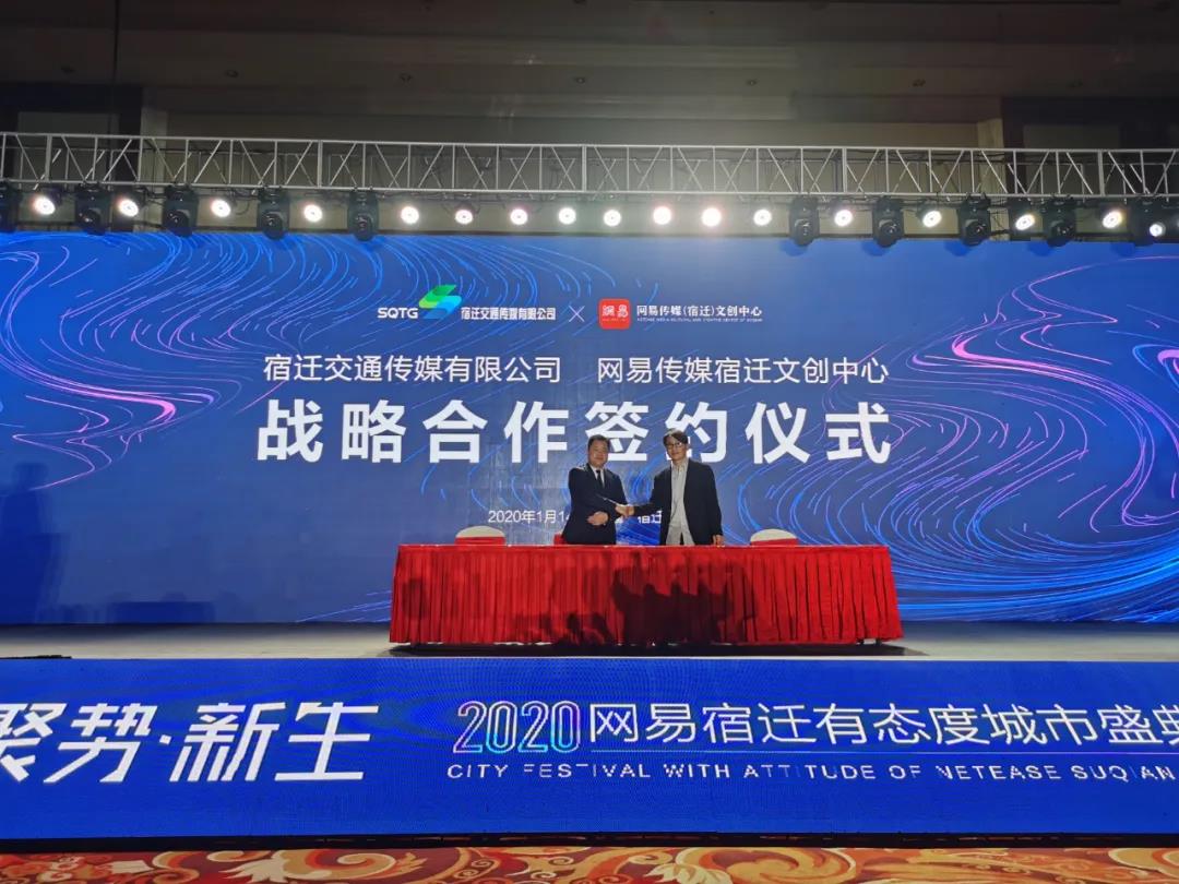 1月14日下午,宿迁交通传媒有限公司与网易传媒(宿迁)文创中心在宿迁运河金陵酒店举行战略合作签约仪式。