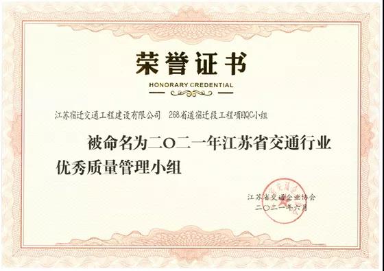近日,宿迁交建268省道宿迁段工程项目QC小组、洋河大道TJ2标QC小组、宿迁市高铁商务区路网工程QC小组被江苏省交通企业协会授予“2021年度江苏省交通行业优秀质量管理小组”称号。