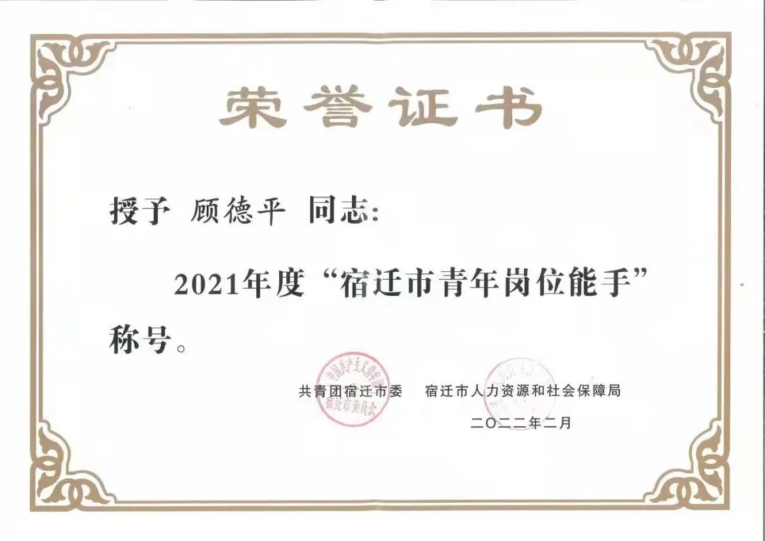 【宿迁交建】宿迁交建顾德平荣获2021年度“宿迁市青年岗位能手”称号