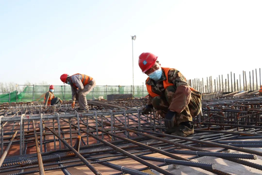 4月8日,宿迁市北京路快速化改造工程现场施工人员正在有条不紊地绑扎钢筋、焊接、冲洗、安装……复工生产平稳有序推进。