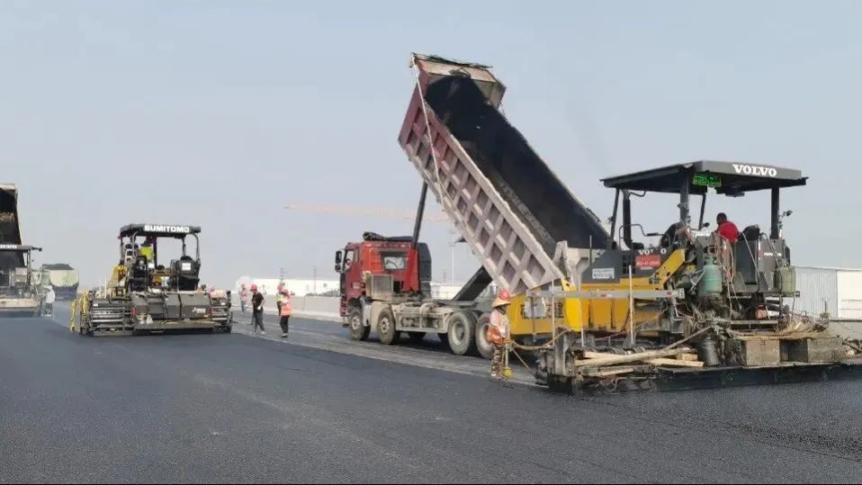 在北京路快速化改造工程2标段施工现场,建设者们顶着太阳,脚踩着沥青路面,身后是翻滚着沥青料的摊铺机,他们汗流浃背,在烈日下仍然以饱满的热情和良好的工作状态投入到沥青摊铺工作中。