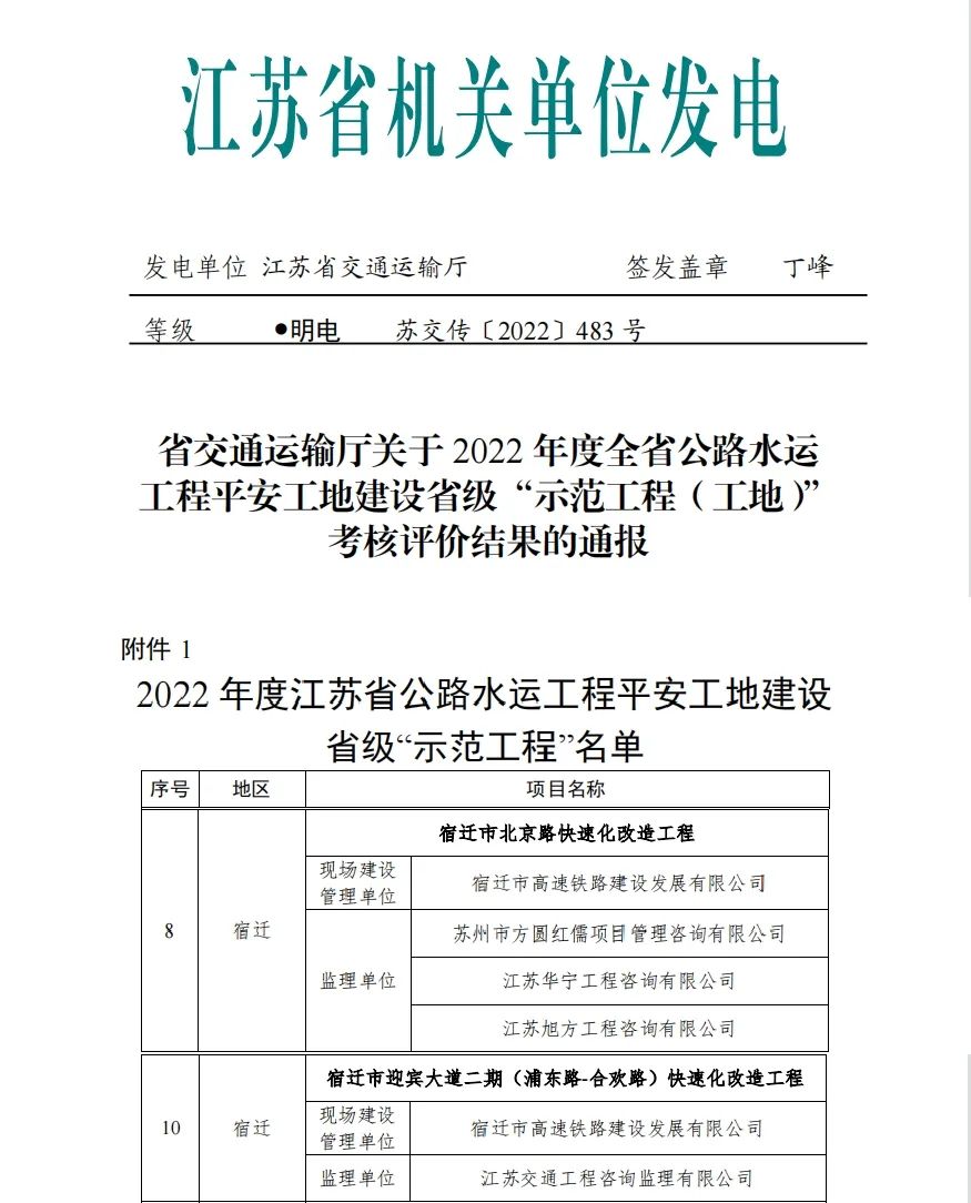 近日,江苏省交通运输厅对2022年度全省公路水运工程平安工地建设省级“示范工程(工地)”名单进行了公示,宿迁市北京路快速化改造工程、宿迁市迎宾大道二期(浦东路-合欢路)快速化改造工程2个项目获评江苏省公路水运工程平安工地建设省级“示范工程”称号。