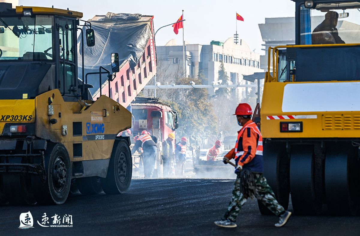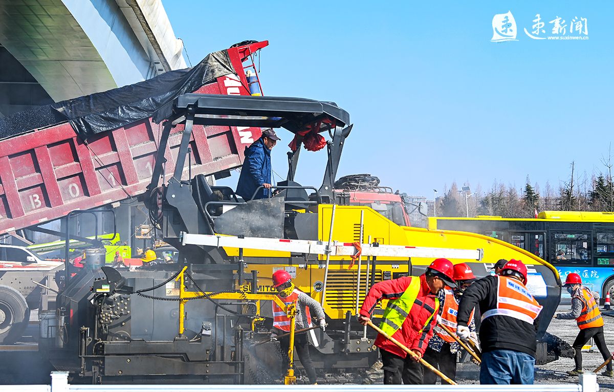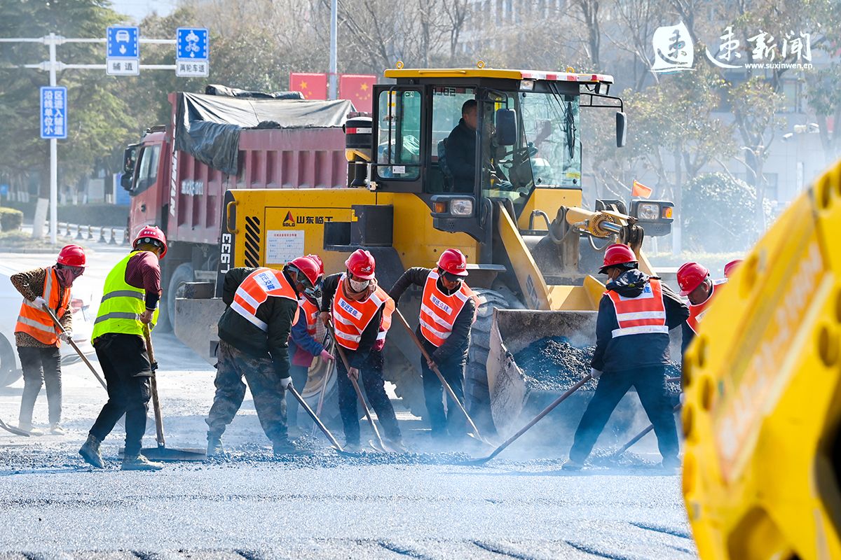 2月19日,宿迁市迎宾大道二期快速化改造工程建设现场一片火热,数十台车辆及机械设备正在进行沥青下面层摊铺,建设者开足马力,加快推进工程进度,力争早日建成通车。