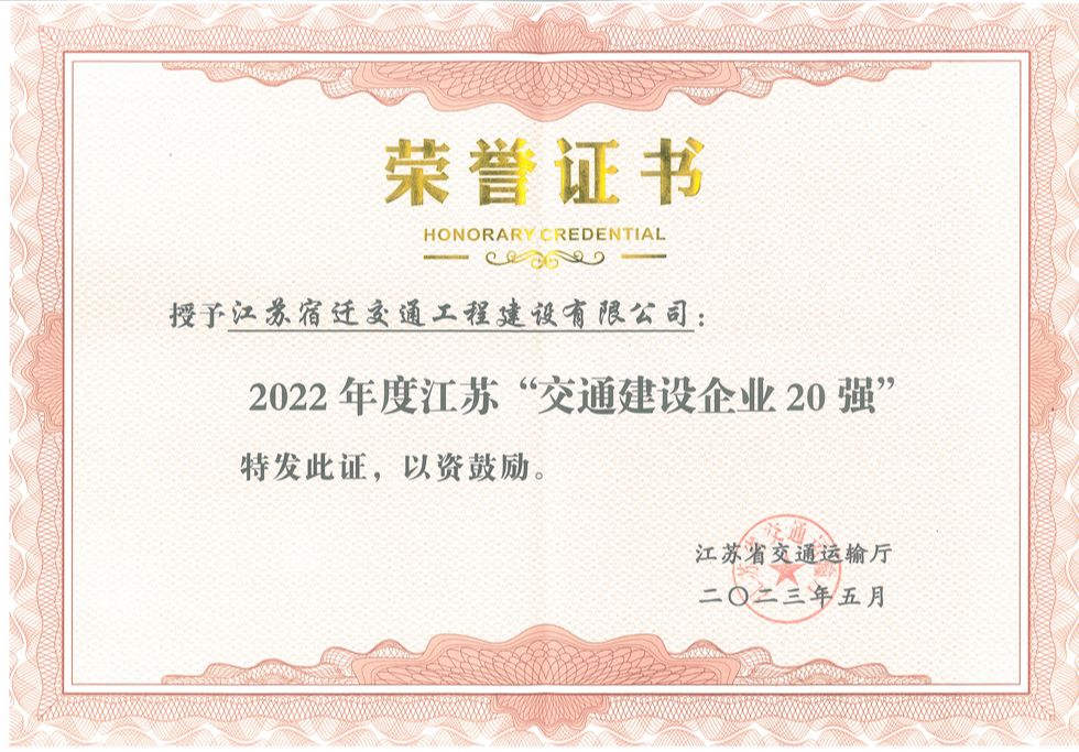 5月16日,江苏省交通运输厅发布2022年度江苏“交通建设企业20强”认定企业名单,宿迁交建榜上有名,系我市唯一一家入选企业。