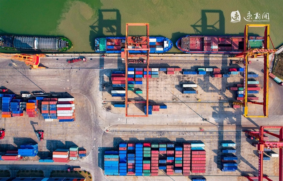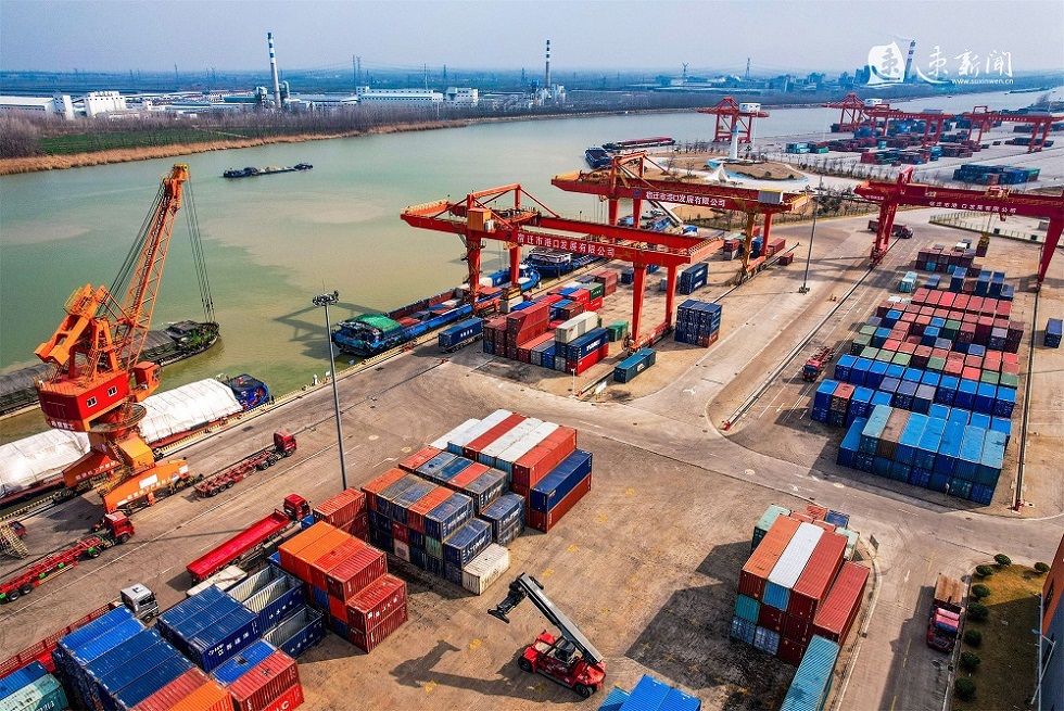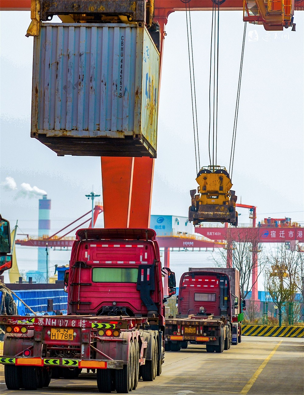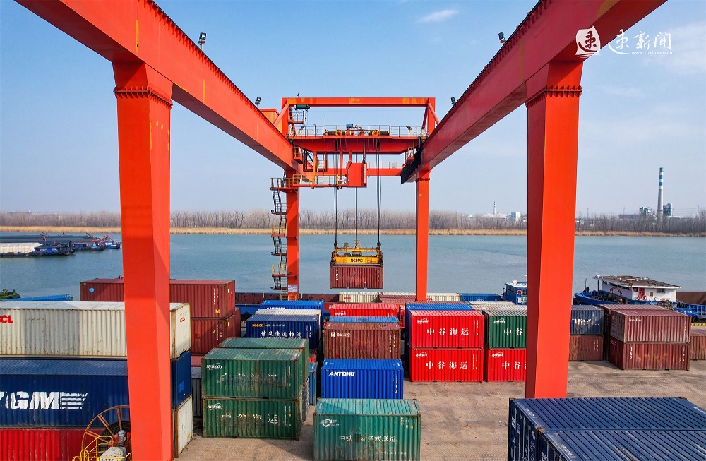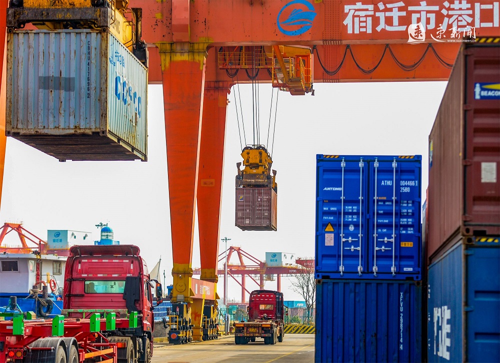 2月18日,在运河宿迁港集装箱码头,工人们正在有序作业,运输车辆来回穿梭,起重机正在紧张地装卸货物,力争龙年“开门红”。