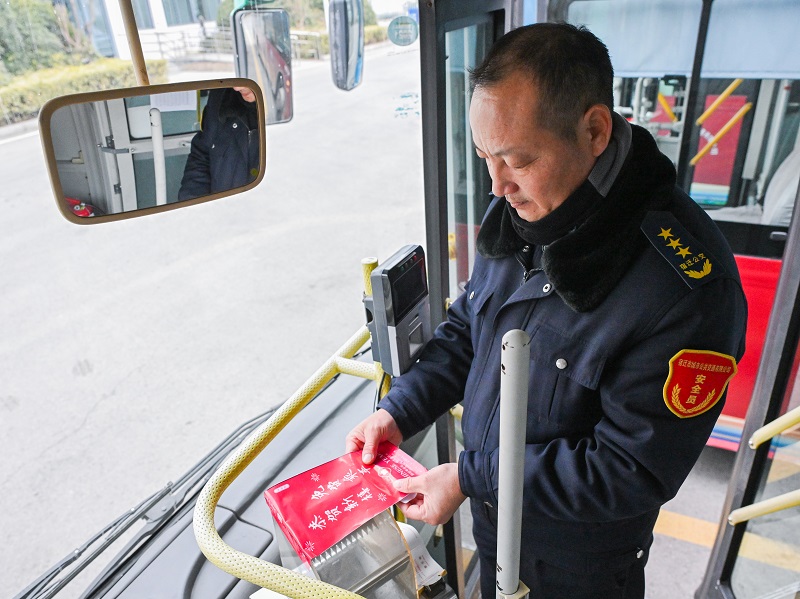 1月24日,宿迁市公交车驾驶员手拿免费乘车投币箱封口贴封闭投币箱。为了满足春节期间市民和游客的出行需求,营造温馨便捷氛围,鼓励和倡导市民绿色出行,宿迁市所有城市公交、城乡公交、镇村公交于1月25日至2月4日期间免费乘坐。