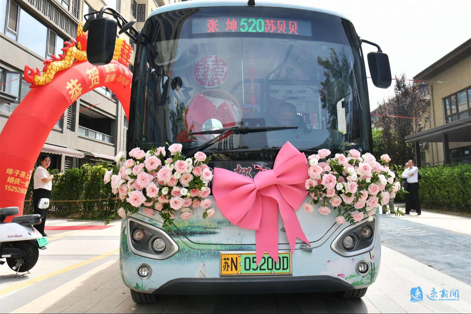 5月4日,宿城区双庄街道白堡社区新城玺樾府小区内,两辆装扮一新的“酒都小巴”成为亮眼的风景:车头“520”的标识格外醒目,车窗上大红“喜”字熠熠生辉,车厢内红色装饰交相辉映,处处洋溢着喜庆的氛围。