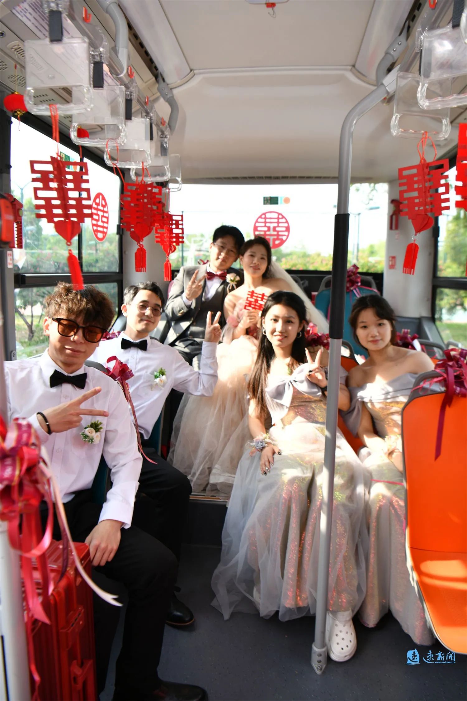上午10时,新郎张坤坐上公交婚车去迎娶心爱的姑娘。谈及选择公交婚车的初衷,张坤笑着分享:“用公交车当婚车是我爱人的想法,我俩一商量,都觉得这个想法特别有意义。亲朋好友都能聚在一起,大家一路热闹相伴,共同见证我们的幸福时刻。比起传统的豪车接亲,这样的氛围更热闹、更温馨。”
