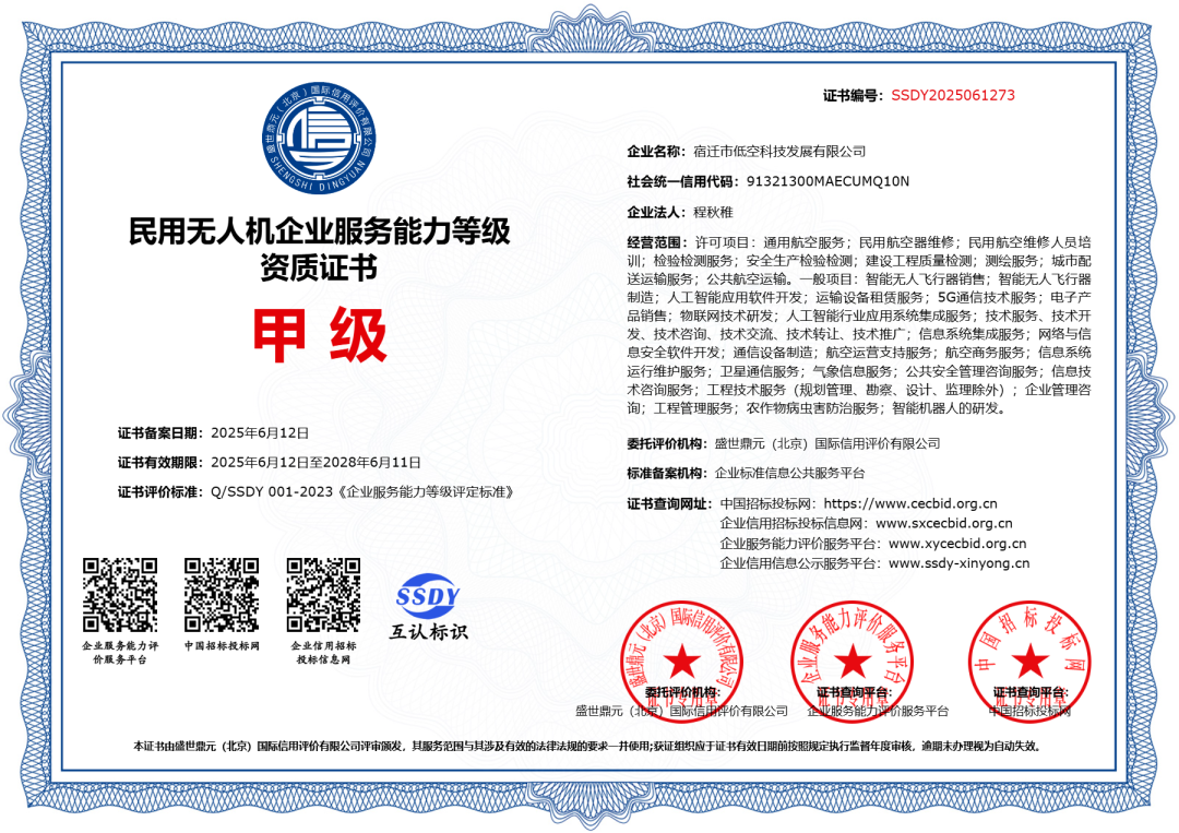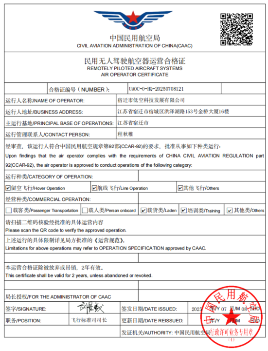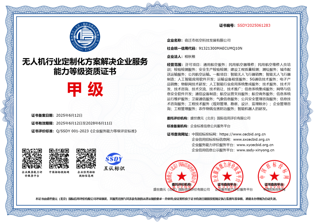 这些资质及合格证的取得,不仅是国家相关主管部门对低空科技公司综合实力、技术能力和安全管理体系的高度认可,也为其在低空经济领域开展更多场景应用和产业合作奠定了坚实的基础。标志着低空科技公司已具备在低空经济核心业务领域提供全方位、专业化服务的能力,能够合规、高效地开展各类低空飞行及相关配套业务。