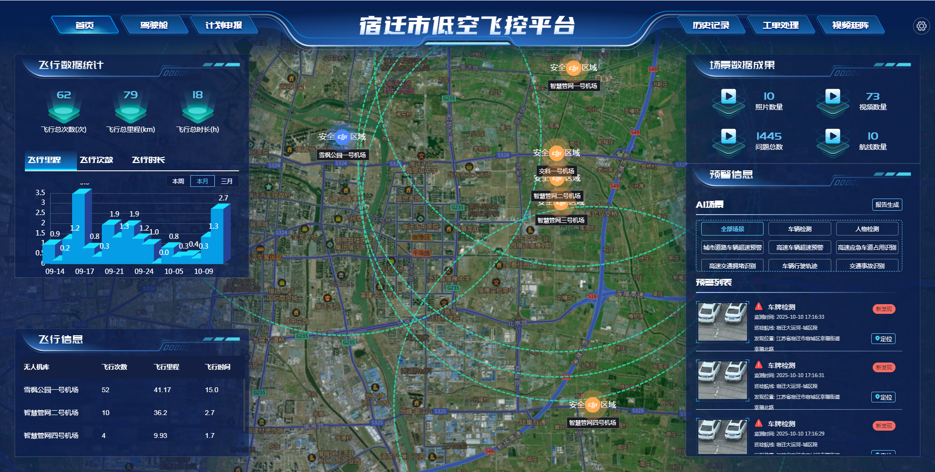 在宿迁市低空飞行服务中心,一组组高效率数据智能化场景应用刷新大众眼球:依托无人机AI平台,自动识别道路施工中隐患行为,同时自动标记隐患位置、推送预警信息并督促相关方整改,形成全链条的管理闭环;通过无人机移动的摄像头,能够实时监控学校周边交通状况,并通过喊话功能引导车辆有序通行……