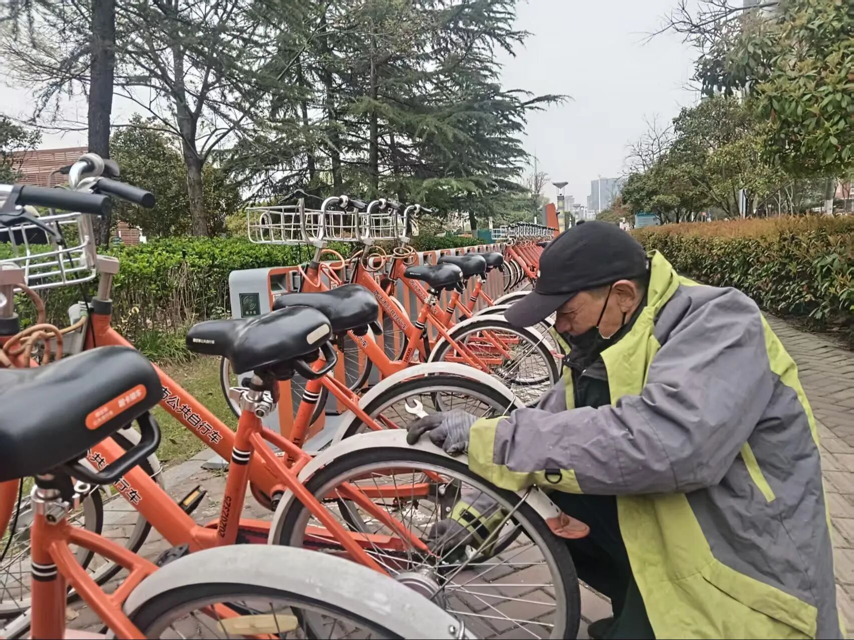 工作人员在维修公共自行车