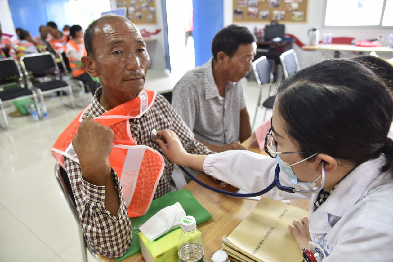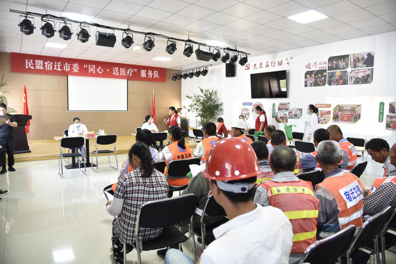 义诊现场,民盟宿迁市委组织的“同心·送医疗”服务队队员为交通工程一线建设者量血压、测血糖等,并针对发现的问题,指导建设者正确治病防病、正确用药。同时,队员讲解了在高温环境下工作的注意事项、意外伤害自救与互救常识等知识,得到一线建设者的一致好评。