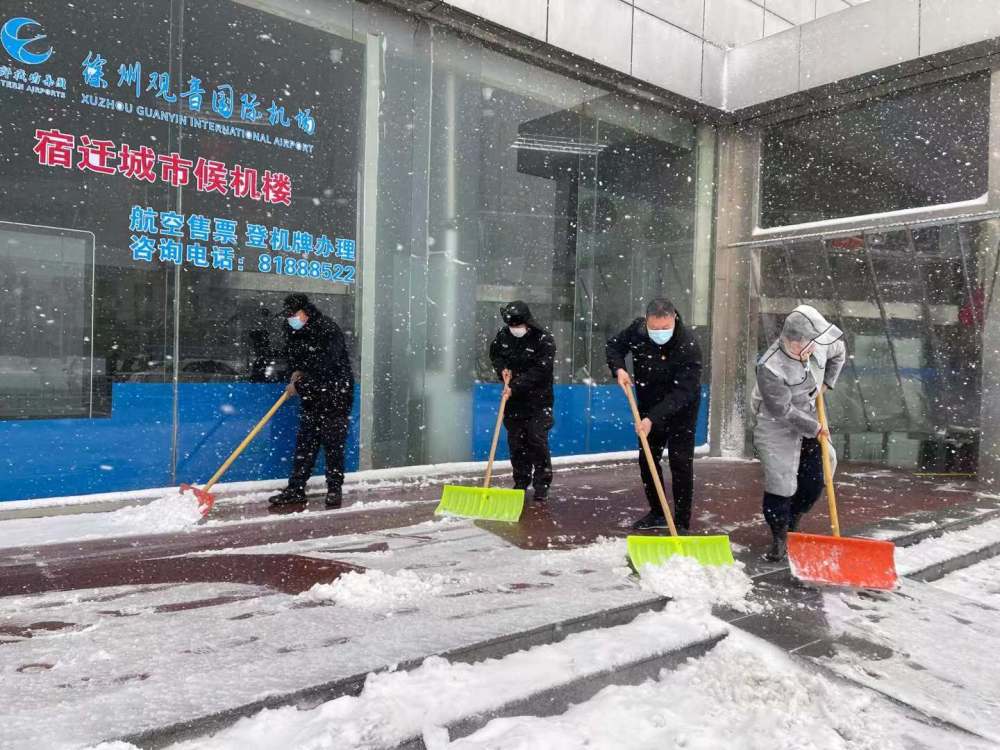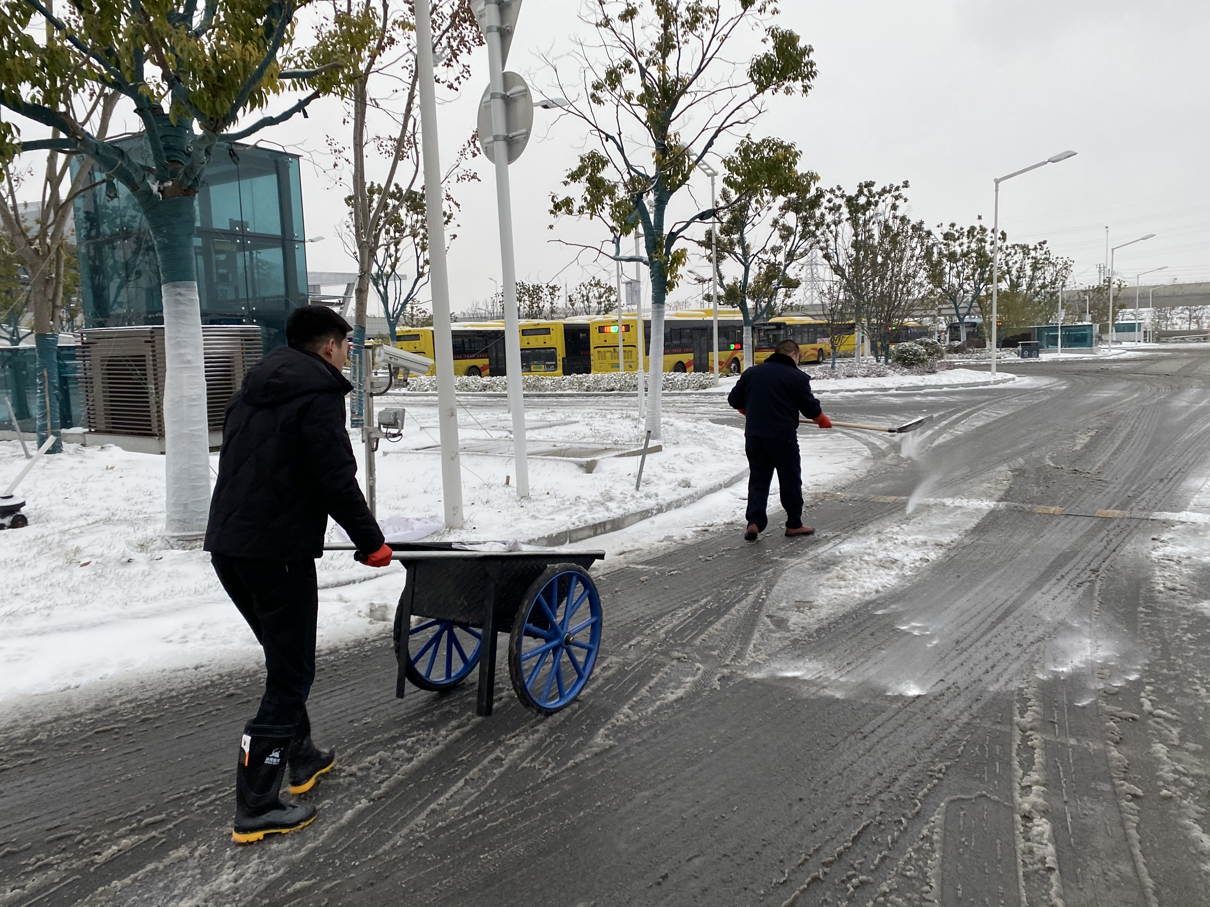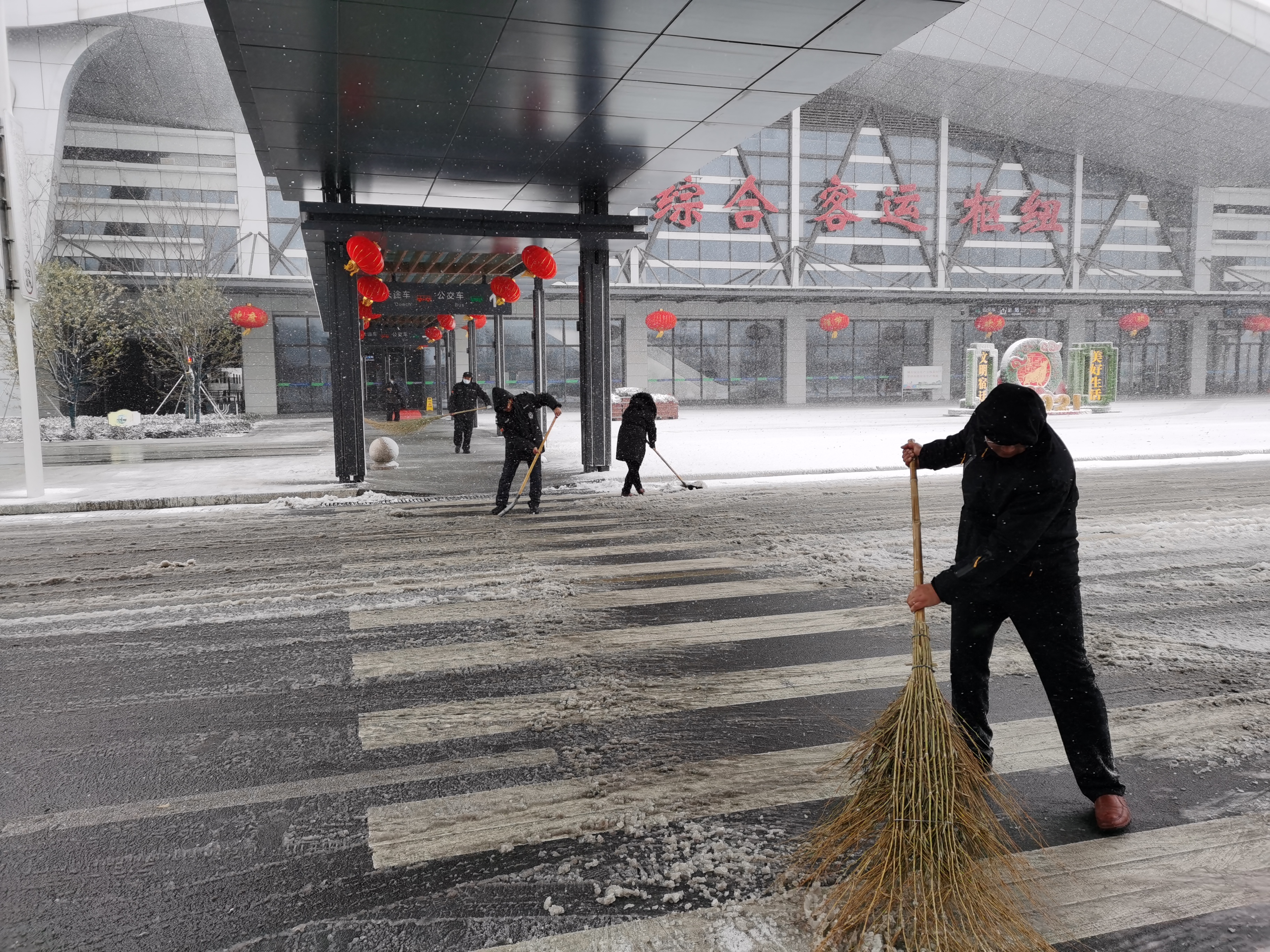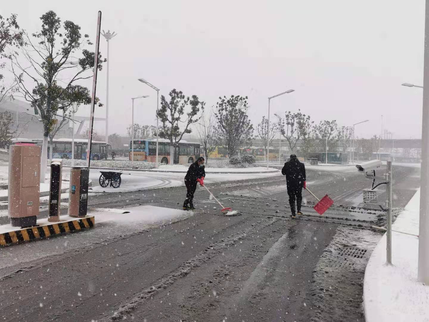 高铁公司组织在岗职工和物业人员,利用推雪铲、铁锹、扫帚等将高铁宿迁站站前广场积雪铲开,对综合客运枢纽外道路、公交停车场等易结冰的路面进行撒融雪处理,确保旅客出行安全。