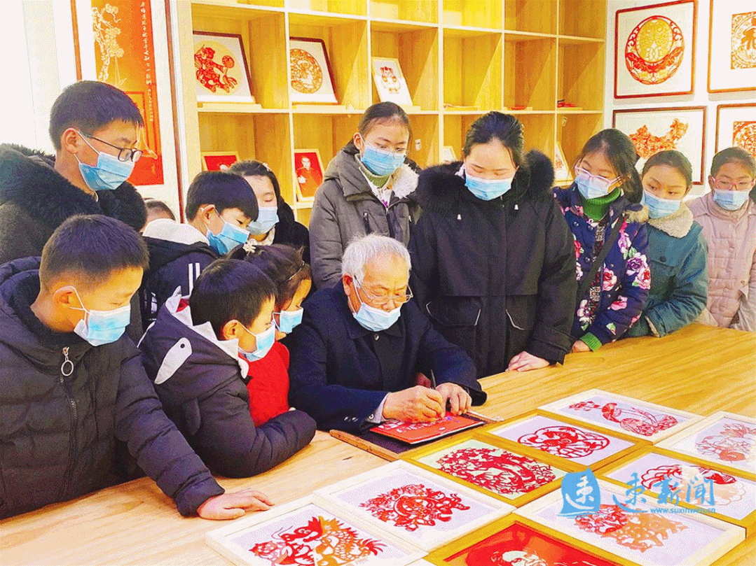宿迁市非物质文化遗产《刻纸门花》项目代表性传承人苏立功向孩子们讲述“压岁钱不变味”的意义和重要性,让孩子从小树立正确的文明新风观念;