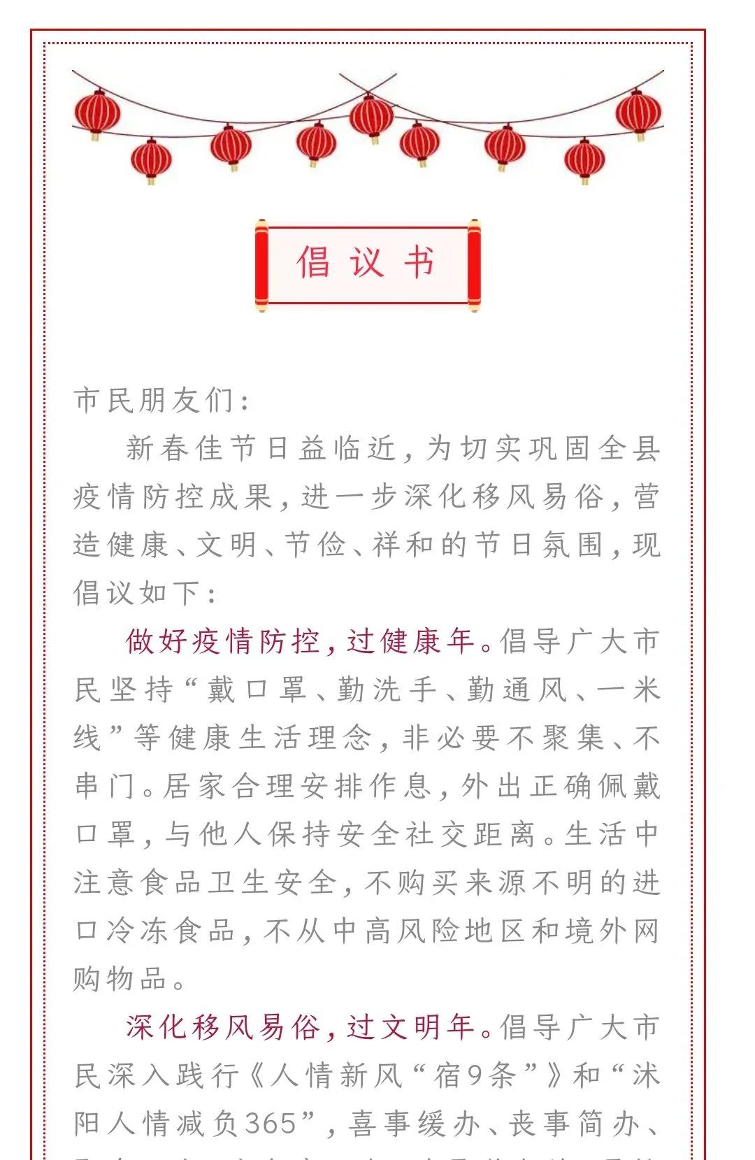 沭阳发布安全文明过大年倡议书,倡导“婚事新办,丧事简办,小事不办”;
