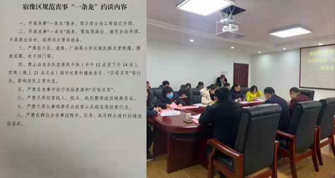 宿豫区召开“丧事一条龙”培训约谈会,规定“丧事一条龙”服务内容,签订承诺书,制定惩处办法。同时,认真落实“红白事缓办简办”要求,向对喜丧事主做好宣传工作,发出倡议书、签订承诺书;