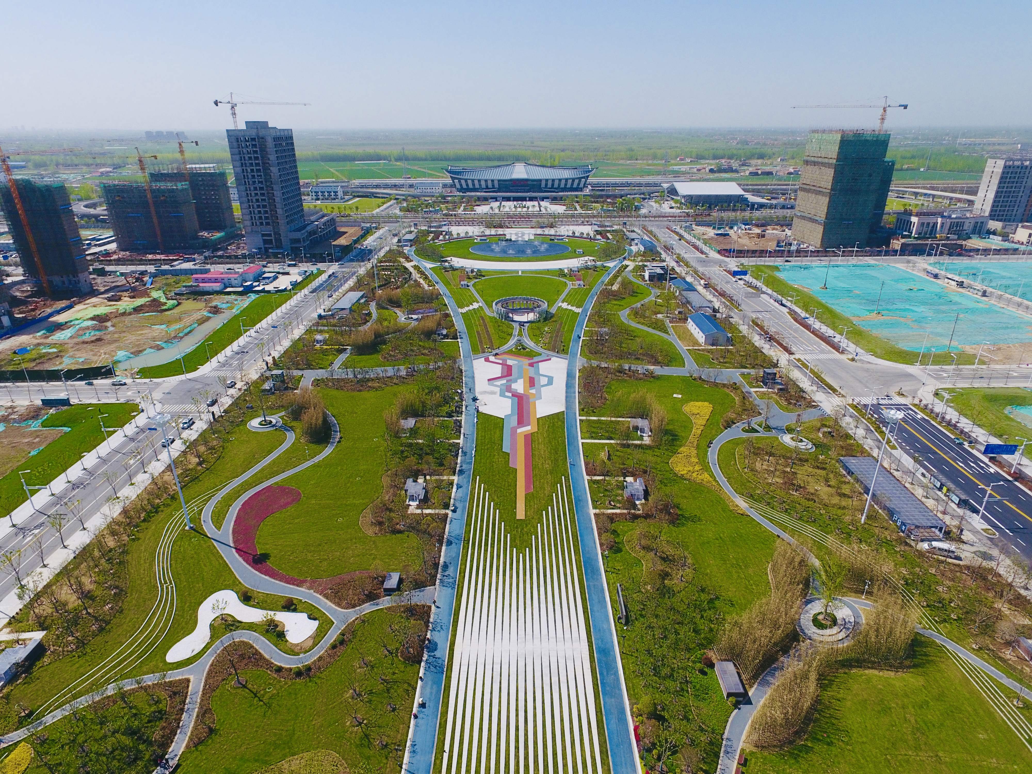 “酒都广场作为高铁宿迁站视线焦点及市高铁商务区核心地标,总体采用中轴形象突出、两侧生态自然的景观格局,强化市高铁商务区的城市轴线、空间序列及生态功能,形成简洁大气的景观布局。”色漫