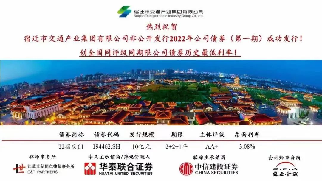 成功发行第一期非公开发行2022年公司债券,发行规模10亿元,期限2+2+1年,由华泰联合证券、中信建投证券联合承销,票面利率3.08%,创全国同评级同期限公司债券历史最低利率!