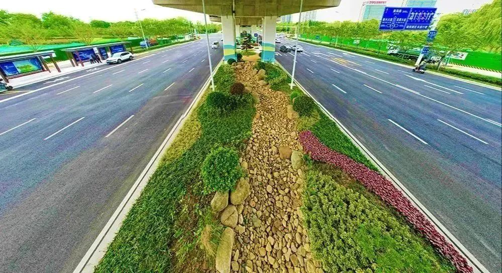 一步一景,已足以倾城。而迎宾大道二期快速化改造工程在景观绿化施工中,还融入了海绵城市设计理念,在宿支路至滨河路、骆马湖路至洪泽湖路、微山湖路至青海湖路,分别以山水、蓝梦、仙踪为主题,用泰山石、蓝色玻璃石、红色玻璃石、灰白砾石及海绵旱溪、花境、造型罗汉松、灌木球等进行巧妙搭配,实现景观提升与“海绵城市”充分融合,打造流畅蜿蜒的绿色海绵线。