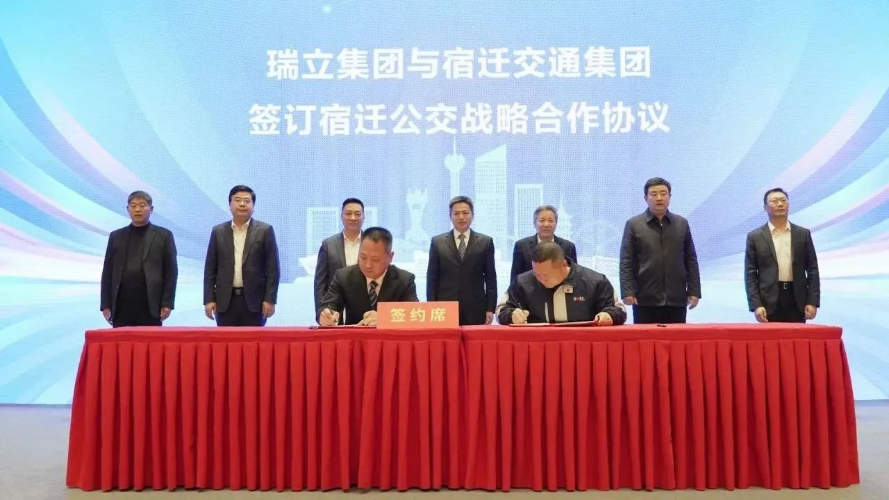 副总经理汪卫东与瑞立集团副总裁徐本光分别代表双方签订了宿迁公交战略合作协议,双方约定在汽车配件、新能源车维修、物流等领域开展全方位和多角度的合作,充分利用和发挥各自在资源、技术、市场、资本、管理等方面的资源优势,提高竞争力,实现双方互利共赢。