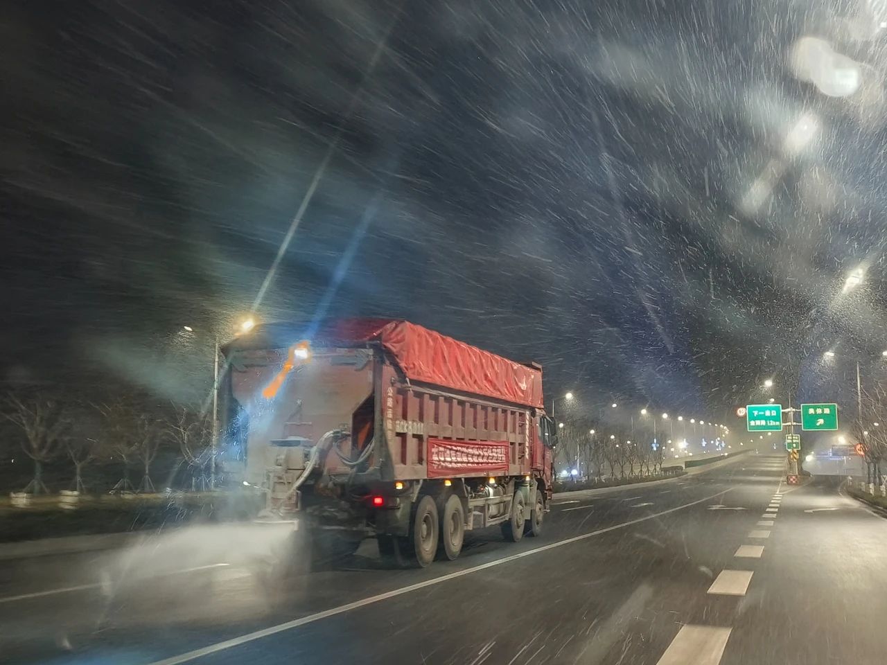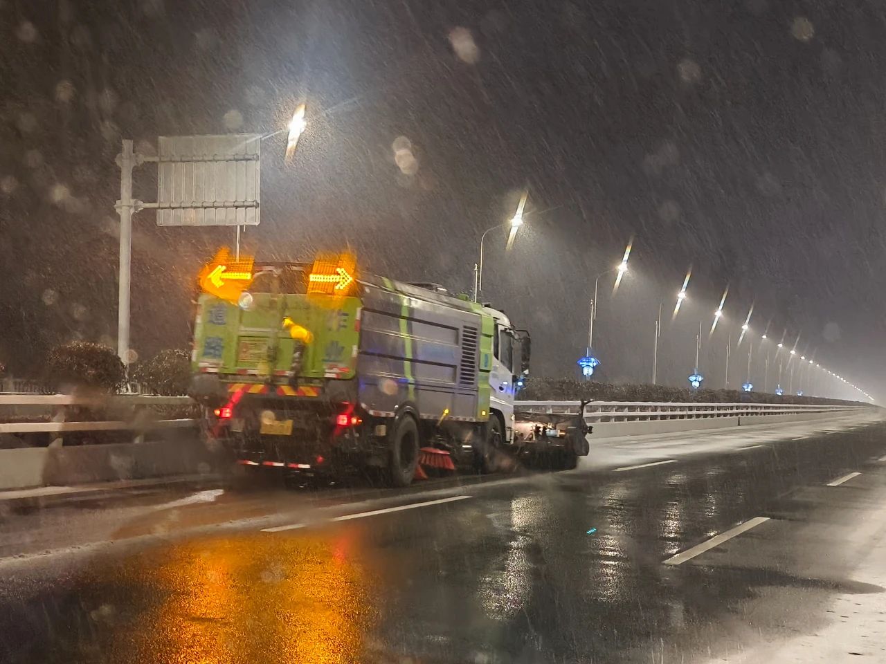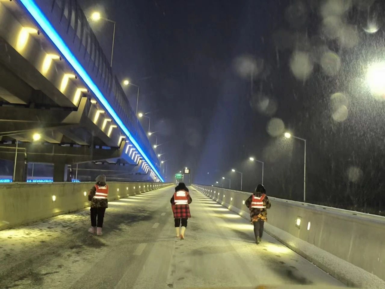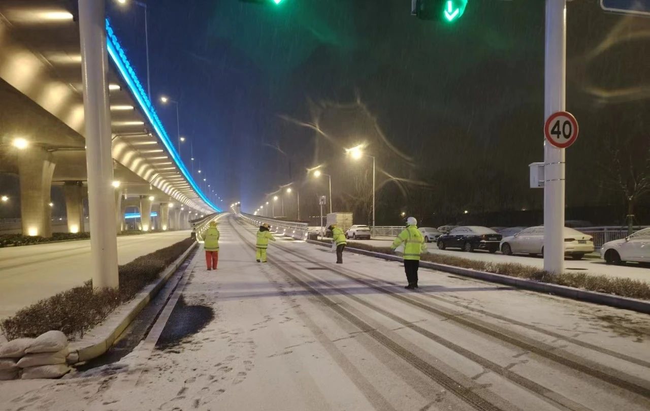 2月1日晚,雪势渐大市区快速路路面出现积雪、结冰情况为了城市的正常有序他们在风雪中执守