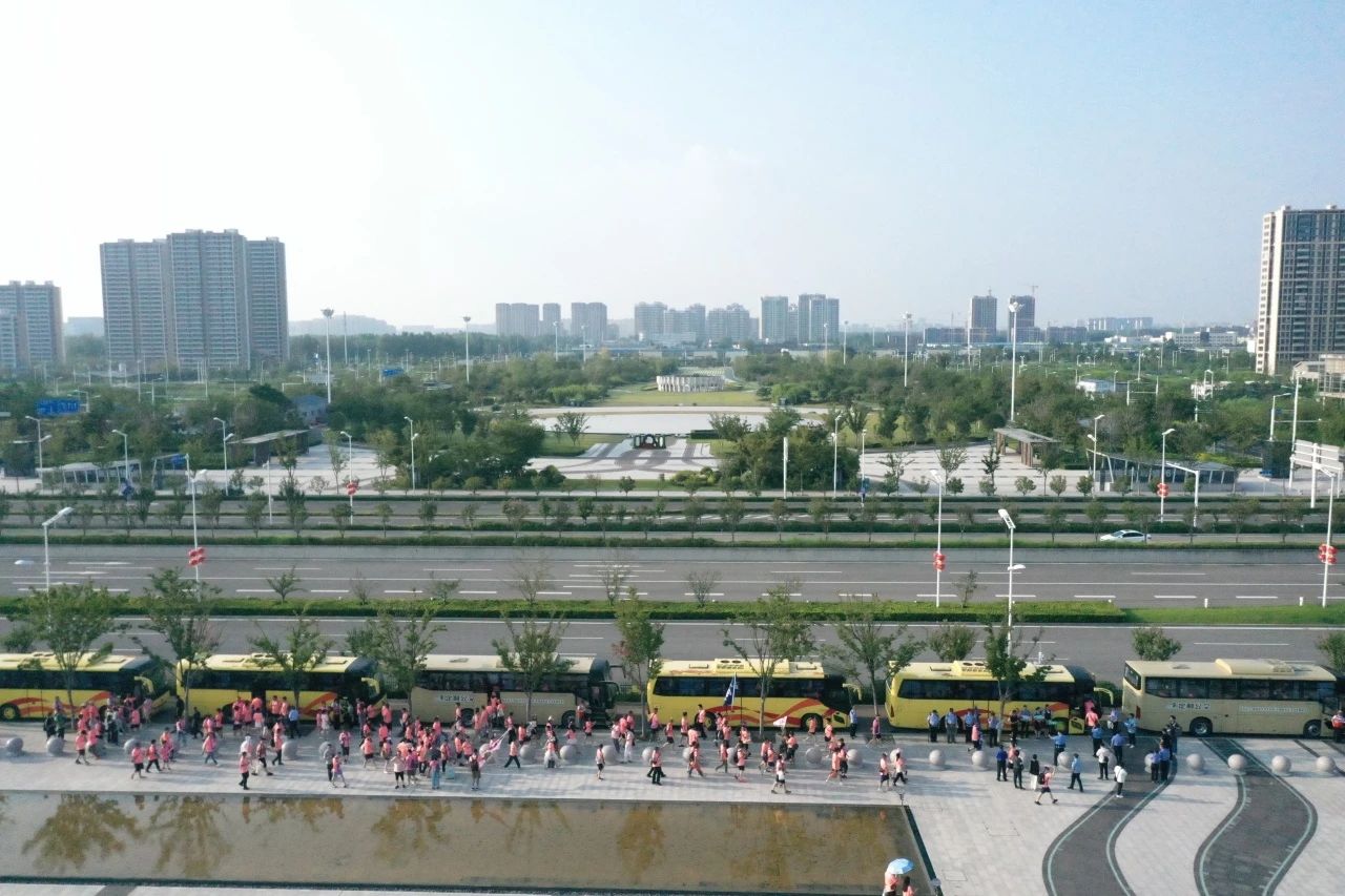 统筹调度的定制公交早已整装待发,志愿者们手持车辆编号牌在车旁引导。