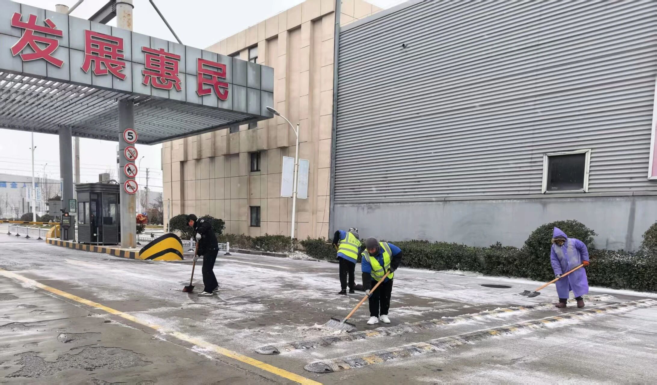 通湖物流园对内部主干道路、仓储区域等处,撒好除雪剂并进行融雪、除雪,在仓库出入口、坡道等易滑区域铺设防滑设施,通过微信群、广播等渠道,向租户滚动发布天气预警与安全提示,全力减轻寒潮影响,保障园区平稳运行。