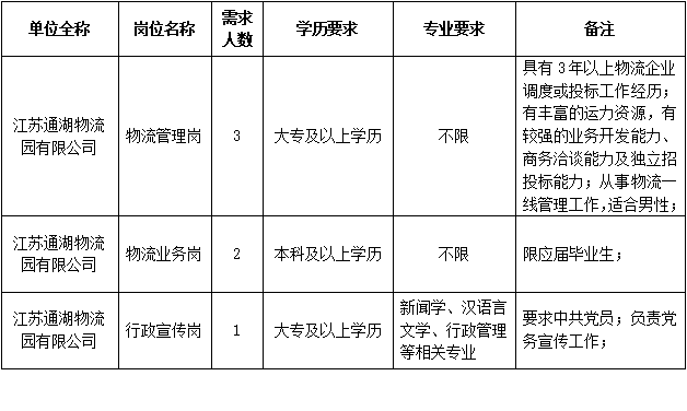 江苏通湖物流园有限公司是一家从事物流经营与管理的国有企业,为满足业务发展需要,现面向社会公开招聘一批劳务派遣制人员。现将有关事项公布如下: