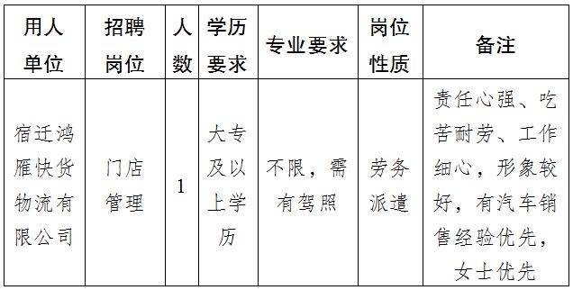1、用工性质为劳务派遣,劳动关系录用人员与劳务派遣公司签订劳动合同,并劳务派遣至宿迁鸿雁快货物流有限公司工作;