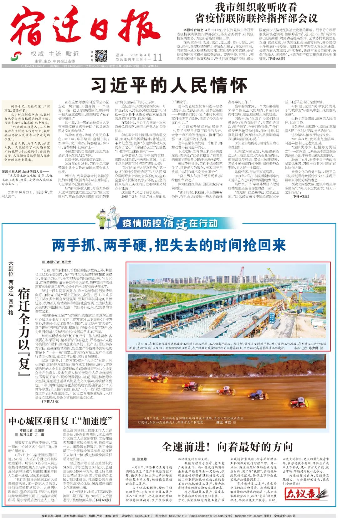 4月11日,《宿迁日报》头版《疫情防控宿迁在行动》专栏聚焦集团重点工程项目复工复产情况。
